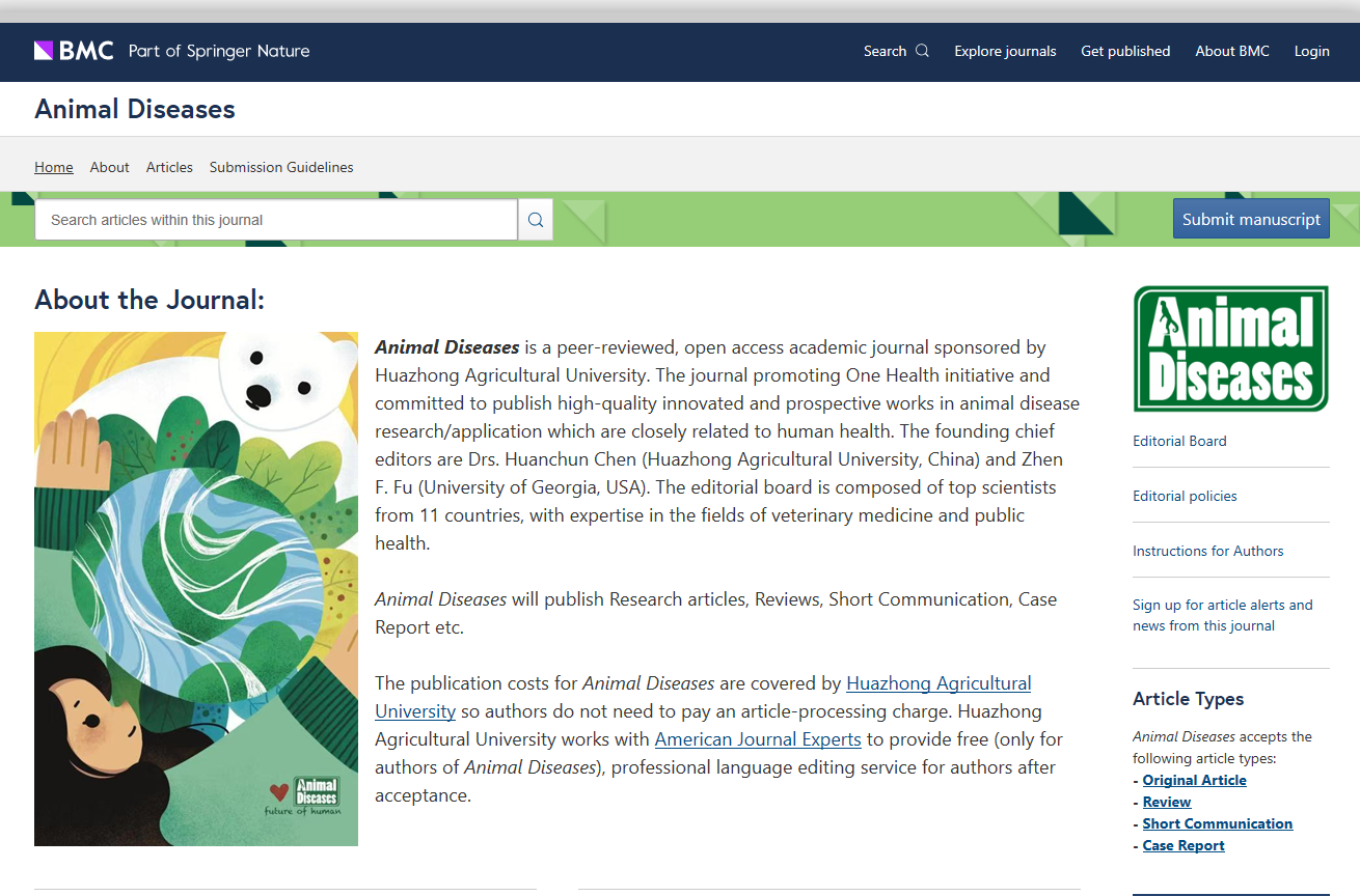 华中农业大学与Springer-Nature旗下 BMC品牌合作策划创办了英文科技期刊Animal Diseases。期刊将重点关注与人类健康密切相关的动物疾病的最新研究和技术进展,聚焦动物疾病相关多学科交叉融合领域,探讨环境变化对动物和人类健康构成的挑战和对策,打造动物疾病领域基础研究与应用研究国际一流期刊。