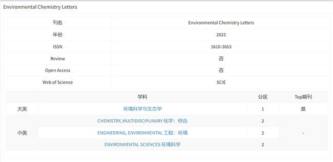 Environmental Chemistry Letters入选中科院1区TOP期刊