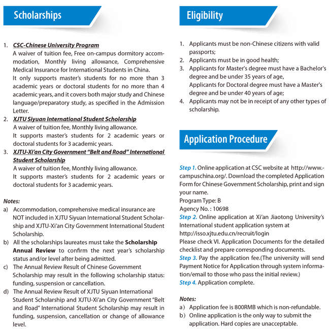 There are three types of scholarships available for covering tuition fees, living allowance, and medical insurance for international students studying at Xi’an Jiaotong University.