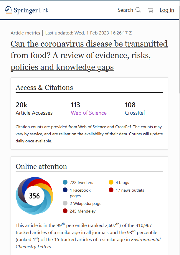 Can the coronavirus disease be transmitted from food? A review of evidence, risks, policies and knowledge gaps. Environmental Chemistry Letters. https://doi.org/10.1007/s10311-020-01101-x (Published 1 October 2020; Submitted 3 September 2020) (JCR Q1, IF 15.7) *ESI Highly CIted Paper