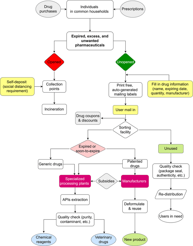 【作者注】医疗条件的改善和全球人口老龄化加剧了人们对药物的需求。COVID-19大流行期间人们大量购买、储存药物以及处方药的过剩,造成了大量excessive, expired和其它unwanted pharmaceuticals在家庭及用户手中累积。当前针对家庭waste pharmaceuticals的处置方法是将其收集起来后作为hazardous wastes集中焚烧。这一方法依赖于对家庭waste pharmaceuticals定期进行大规模collections。然而,这些take-back programs仅在少数国家和地区available, 在新冠lockdown期间亦无法正常实施,导致大量药物在用户手中闲置至过期。与此同时,持续的新冠疫情导致药物产能受限,加剧了一些药物的短缺。FDA报道药物在超期很长时间后(as long as 15 years)其活性成分(active pharmaceutical ingredients,APIs)仍保持完好。大多数化学合成药matrix简单且成分稳定。但迄今为止仍缺乏一项有效、可持续的闲置与过期药物管理策略。针对这些药物的分类回收与活性成分提取与再利用,是减少此类bioactive污染物向环境排放,同时解决药物及原料短缺,实现循环经济的有效方法。实现这一目标的难点在于回收药物的精分、API提取、quality check及商业可行性。本文提出一种新的unwanted药物回收利用策略,利用现有Internet与logistics infrastructure,由owners(而非集中回收处理facilities)对unwanted药物进行分类并在线提交信息,再由系统auto-generate free coded mailing labels,实现已使用药物与unopened药物、过期药物与non-expiring药物的separate collection。再利用现有物流网络将unopened药物mail in至集中的sorting facilities,利用machine-based sorting自动读取unopened药物上的codes,基于用户提供的信息,实现依据药物的有效成分、expiring date和药物形态(tablets, capsules, gels)的精分。完成分类后,可利用现有的化合物分离与提取技术,对药物集中进行API extraction 或return to manufactures for de-formulation and reuse, or re-distributing to other patients in need, closing the loop in managing the flow of pharmaceuticals.