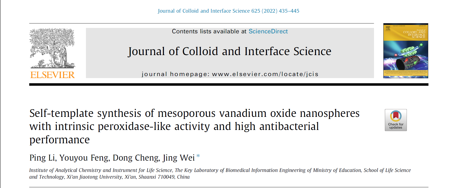 祝贺李萍的研究结果被Journal of Colloid And Interface Science (IF: 8.1279)接收并在线发表