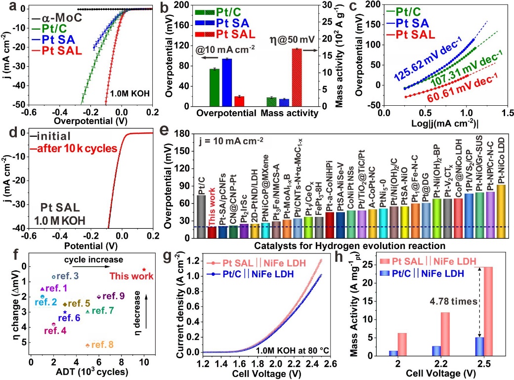 图3. 碱性HER和AEMWE装置性能表征。(a)析氢极化曲线; (b) 10 mA cm-2电流密度下的过电位(左图)和-50 mV vs RHE条件下的铂质量归一化活性(右图); (c)低过电位区间的塔菲尔斜率图; (d)Pt-SAL/α-MoC/C催化剂在10,000次循环后的稳定性测试结果; (e, f)Pt-SAL/α-MoC/C与其他先进铂基催化剂的性能对比; (g)Pt-SAL/α-MoC/C∥NiFe LDH与Pt/C∥NiFe LDH体系的AEMWE极化曲线比较; (h)Pt-SAL/α-MoC/C和Pt/C在质量活性上的对比分析。