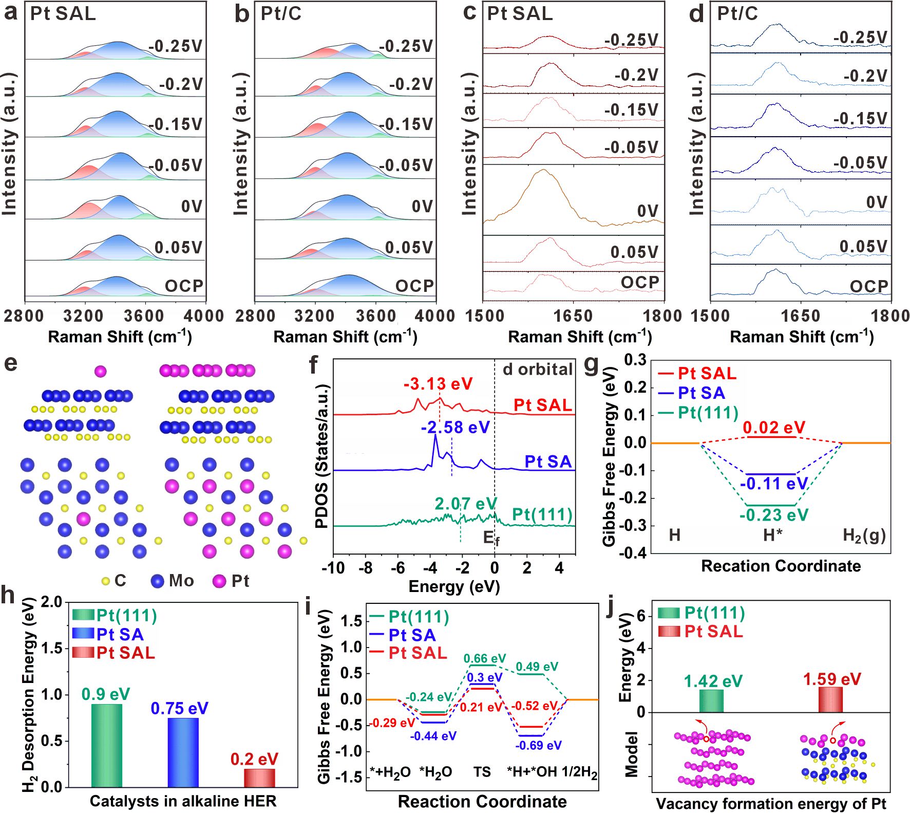 图4. 催化机理研究。(a-d) Pt-SAL/α-MoC催化剂在反应过程中的原位拉曼光谱分析,显示界面水分子的结构演变; (e) 铂单原子(Pt-SA, 左)和铂单原子层(Pt-SAL, 右)的密度泛函理论(DFT)模型对比; (f)铂d带中心态密度(PDOS)分布; (g-i) 氢吸附自由能(ΔGH*), H2分子脱附以及H2O分子解离能垒的理论计算结果; (j)铂空位形成能分析。