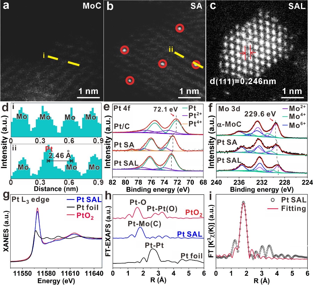 图 2. (a) α-MoC/C, (b) Pt-SA/α-MoC/C 和 (c) Pt-SAL/α-MoC/C 的AC-HAADF-STEM图像; (d) 图a和图b中黄色标记线对应的线强度分布分析; (e) Pt 4f和(f) Mo 3d 的 XPS 分析结果; (g) Pt L3 边以及 (h) Pt-SAL/α-MoC/C, Pt 箔和 PtO2 的傅里叶变换XANES光谱; (i) Pt-SAL/α-MoC/C 在 R 空间中的拟合分析结果。