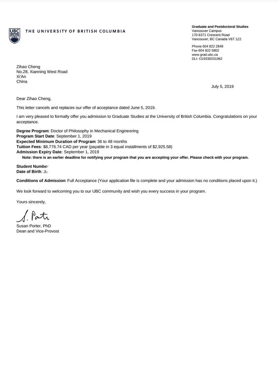 - 祝贺课题组硕士研究生程子豪同学成功获得 THE UNIVERSITY OF BRITISH COLUMBIA 的博士全奖 offer 。不列颠哥伦比亚大学( University of British Columbia ,简称 UBC ,又译 “ 英属哥伦比亚大学 ” 等),始建于 1908 年,前身为麦吉尔大学不列颠哥伦比亚分校( McGill University College of British Columbia ),于 1915 年获批独立,是加拿大著名的公立研究型大学,环太平洋大学联盟、 Universitas 21 和英联邦大学协会成员之一,是不列颠哥伦比亚省历史最悠久的大学,学校位于温哥华市。不列颠哥伦比亚大学被誉为西海岸的明珠,素有 “ 北美最美校园 ” 之誉,每年都吸引许多世界一流学子前来就读,尤以科学研究见长,是世界一流的研究型大学,以教学严谨高质蜚声国际,培养了 8 位诺贝尔奖得主、 3 位加拿大总理、 71 位罗德学者、 58 位奥运冠军、 266 位加拿大皇家学会成员。祝程子豪同学在接下来的博士学习过程中一切顺利,早日学成归来!