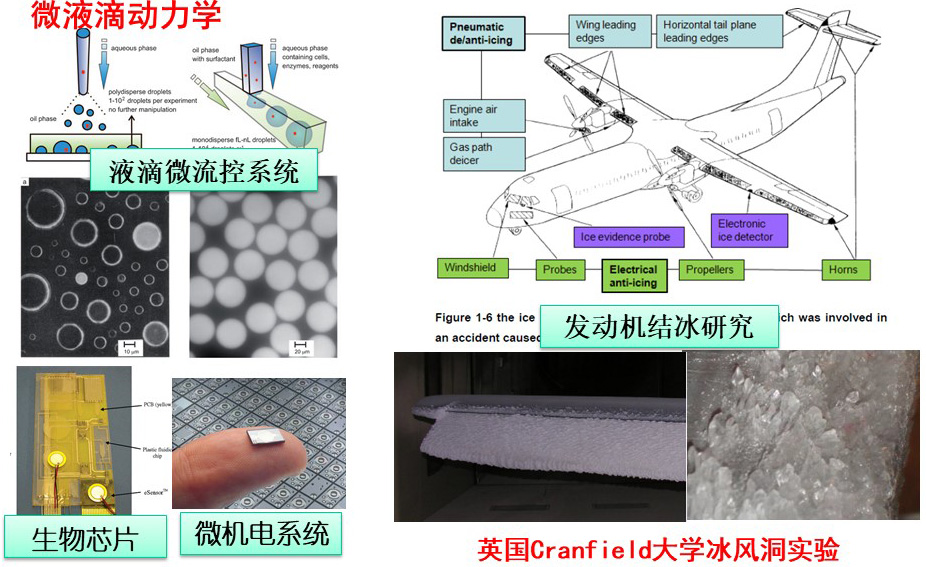 本方向主要瞄准飞机机翼及发动机冷端结冰及融冰控制,研究液滴动力学、由液滴凝结成冰的机理、及其影响因素。微液滴动力学现象异常复杂,很多因素都对微液滴的生成、运动和相互作用均会产生重要影响。目前对微液滴流动机理的认知不足是制约有效控制该流动的主要因素。近年来课题组致力微液滴