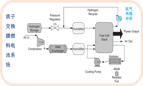 氢气再循环泵是质子交换膜氢燃料电池的核心部件,发挥着不可或缺的多重作用。它将显著燃料电池氢气利用率;将阳极出口水蒸气输送至进口而增湿电池;加速阳极氢气循环以阻止阳极氮气