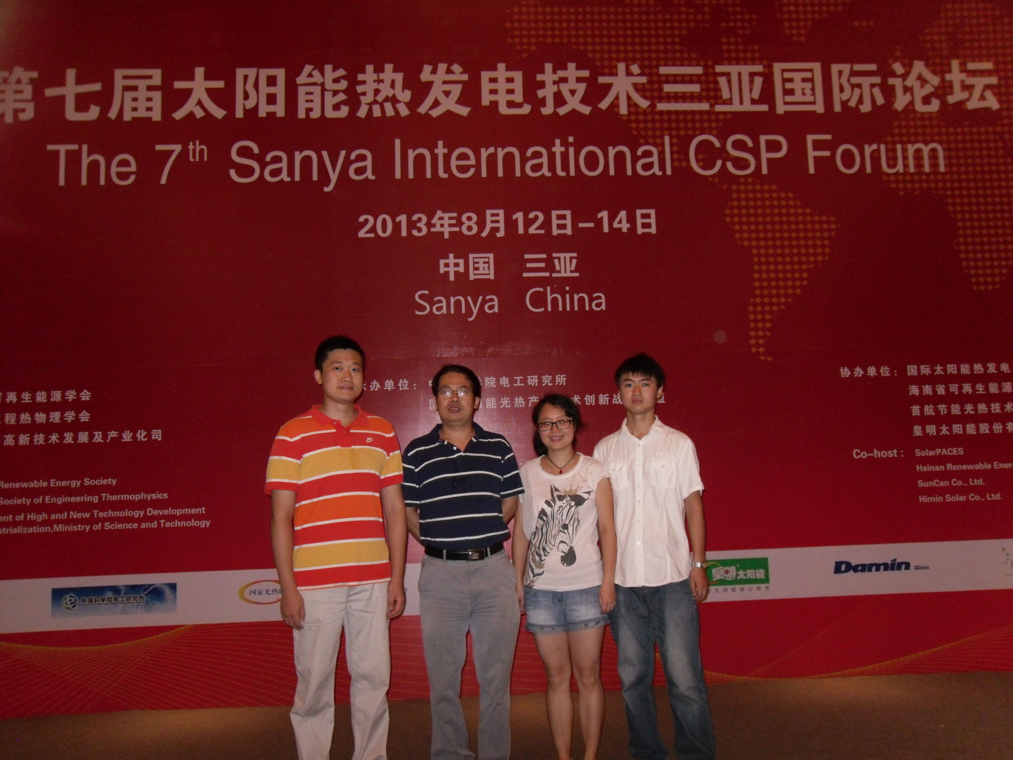 与课题组博士生谢胡凌、屠楠,硕士生戚吉祥于2013年8月11-15日参加了在海南省三亚市举办的2013年太阳能热发电技术三亚国际论坛,并在大会上做了三个口头报告,分别为"太阳能光伏光热系统聚光与跟踪单元的研究",“太阳能腔式吸热器热流密度均匀化研究”和“腔体式太阳能吸热器膜式壁结构模拟优化”。