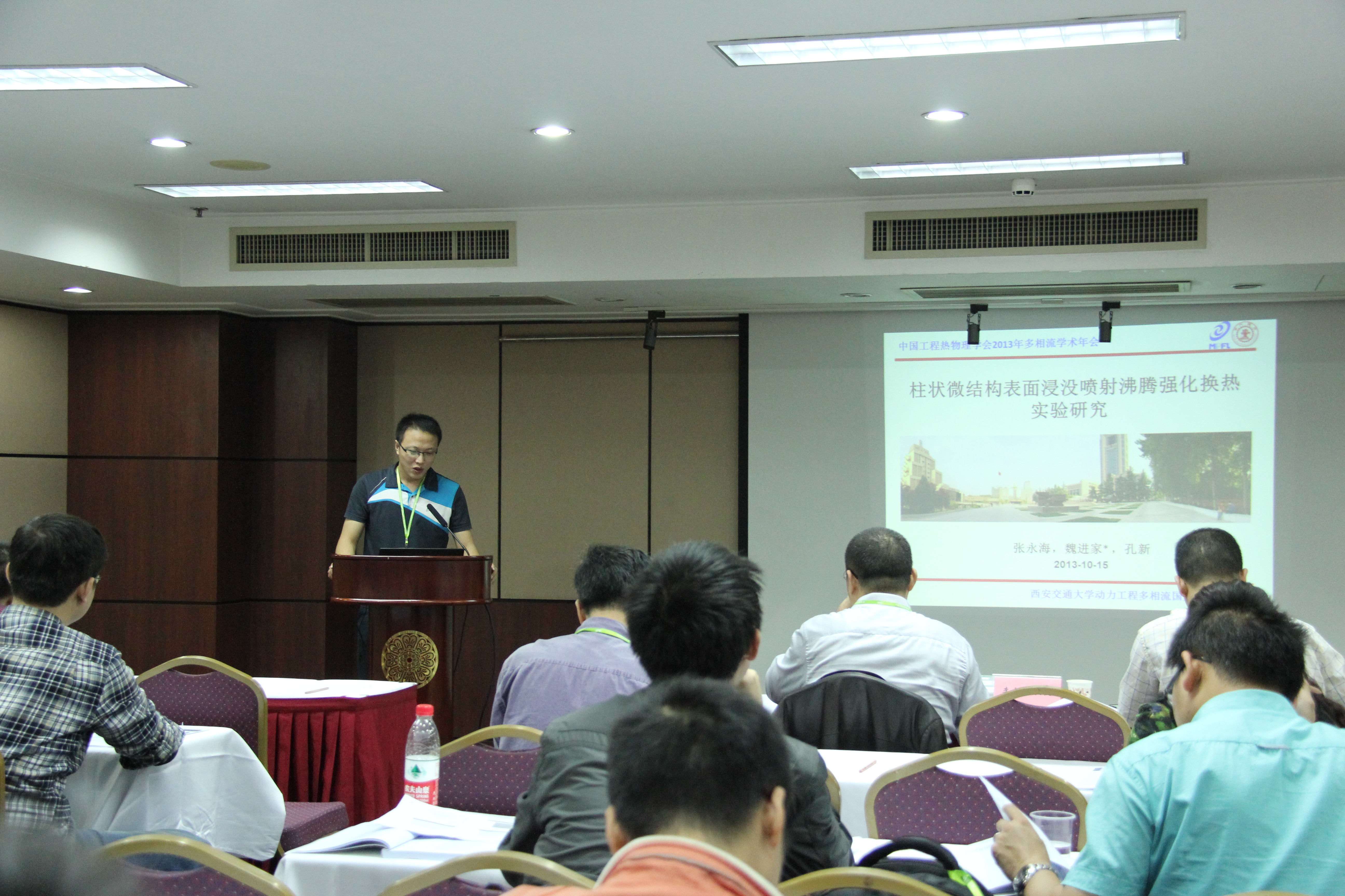 与课题组博士生史宝成、张永海、屠楠和徐娜于2013年10月14日在上海市参加了工程热物理学会多相流学术会议暨国家自然科学基金进展交流会。会议期间担任了气液两相流与沸腾传热传质分会场的主席,博士生史宝成做了题目为“不同设计方案下低比转速离心泵叶轮内三维粘性湍流流动的数值模拟”的口头报告,张永海做了题目为“柱状微结构表面浸没喷射沸腾强化换热”的口头报告,屠楠做了题目为”太阳能腔式吸热器表面热流密度均匀化研究“的口头报告,徐娜做了题目为”拉伸破坏对表面活性剂减阻特性的影响“的口头报告。