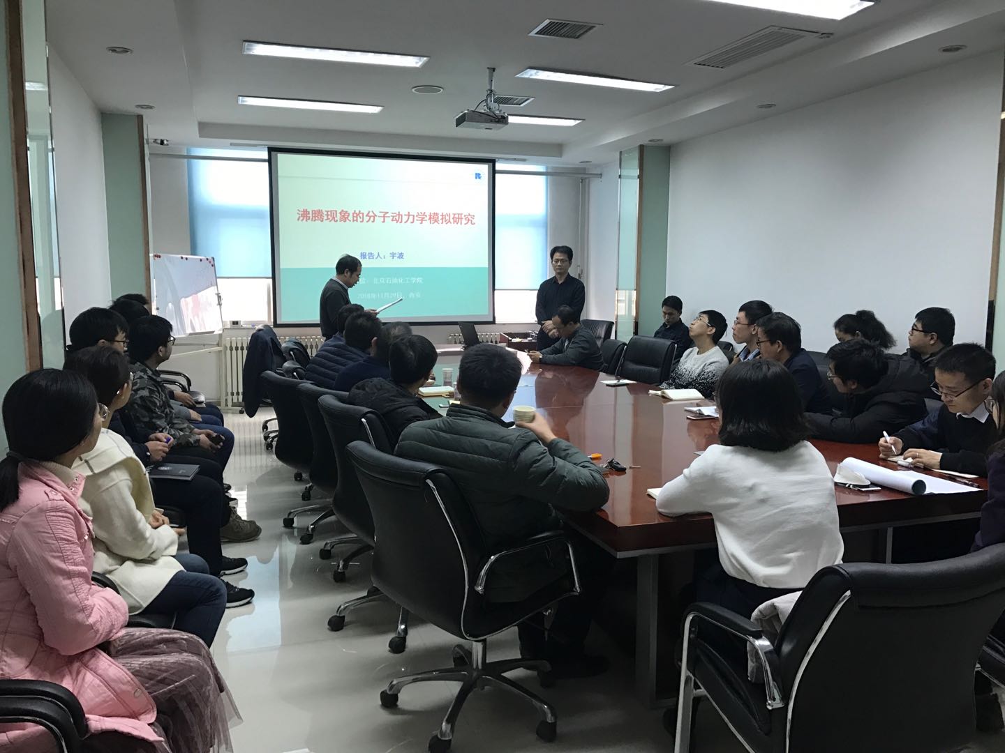 宇波教授作了题为“沸腾现象的分子动力学模拟研究”的主题报告。报告紧密结合与课题组联合申请的国家自然科学基金重点项目,从分子动力学角度出发,研究了壁面润湿性和微结构对沸腾的影响,从原子势能束缚角度探讨了沸腾机理。最后,介绍了微观分子动力学方法、介观LBM方法和宏观方法跨尺度协同理论优点、尚需解决的瓶颈问题和在沸腾传热传质领域广阔的应用前景。报告深入浅出、环环紧扣,受到在座课题组师生的一致好评。