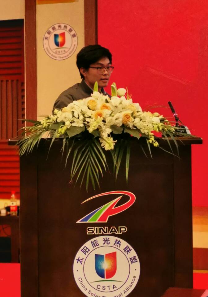 博士生张高明做了“复合抛物面聚光器小型化和均匀性研究及其在光伏光热系统中的应用”的口头报告。报告总结了课题组在复合抛物面聚光器(CPC)消除多次反射截短方法方面的科研成果,并提出了不同截短位置消除多次反射CPC的设计方法,通过对不同截短位置消除多次反射CPC进行光线追踪模拟,基于其聚光效率和聚光均匀性以及光伏光热系统的热电性能对不同截短位置消除多次反射CPC进行了优化。会场上,与内蒙古工业大学的吴泽同学就二维光-热-电耦合过程中一些细节展开了讨论。