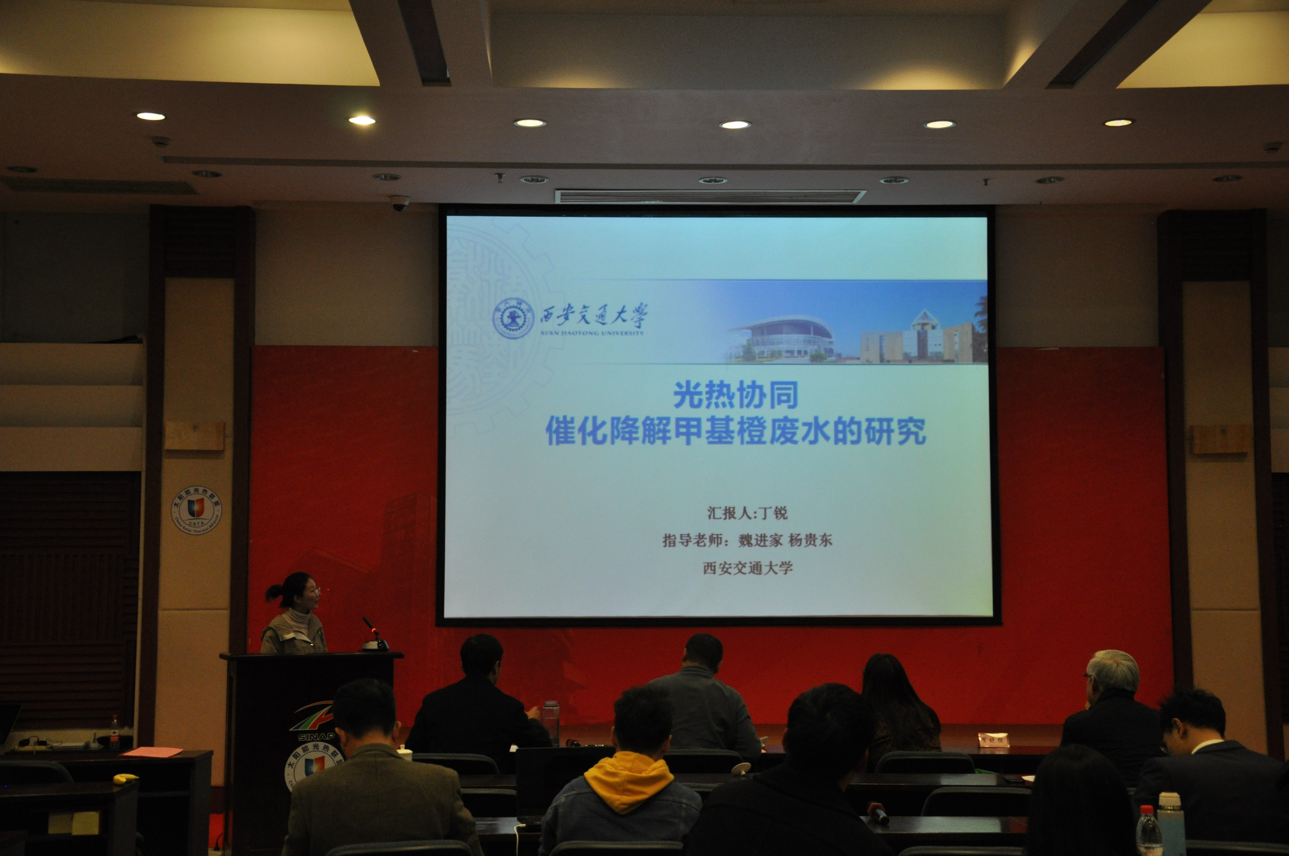 硕士生丁锐做了题目为“光热协同催化降解甲基橙废水的研究”的口头报告。光催化降解水污染是一种有效的解决难降解有机污染物的方式,但常见催化剂仅能利用很少部分的太阳能,本研究使用光热协同催化的方式,提升降解效率。本研究利用氙灯作为光源模拟太阳光,采用悬浆体系,考察了N掺杂的二氧化钛催化降解甲基橙溶液反应中影响反应速度的相关因素。通过正交试验方法,探究反应温度、太阳光强度、催化剂的投加量、溶液的初始浓度等对反应速率的影响程度,为进一步工程应用设计的重要参数。会场上,内蒙古工业大学的闫素英教授就催化剂的反应机理和光照在光热协同催化过程中的作用展开了讨论。