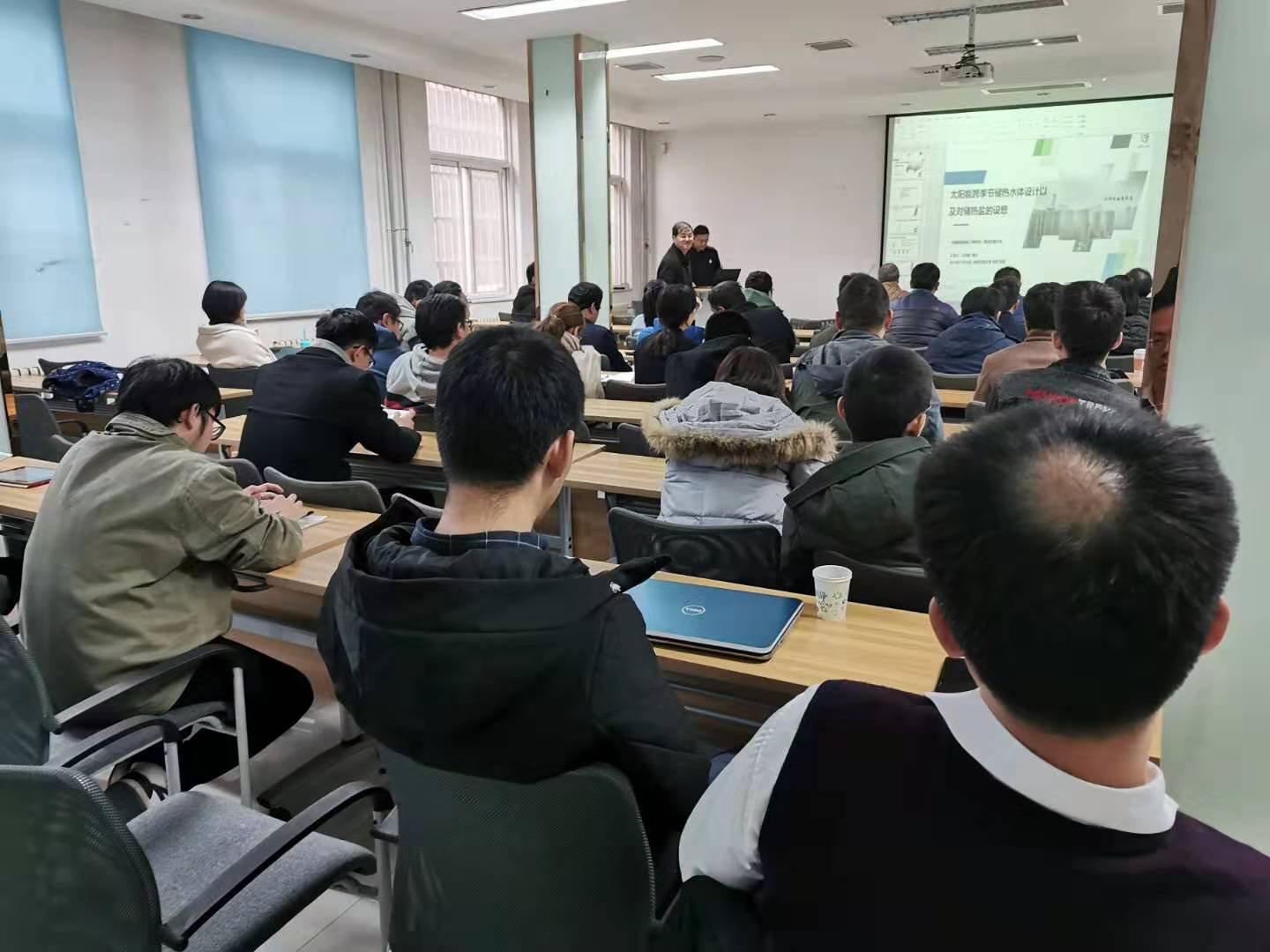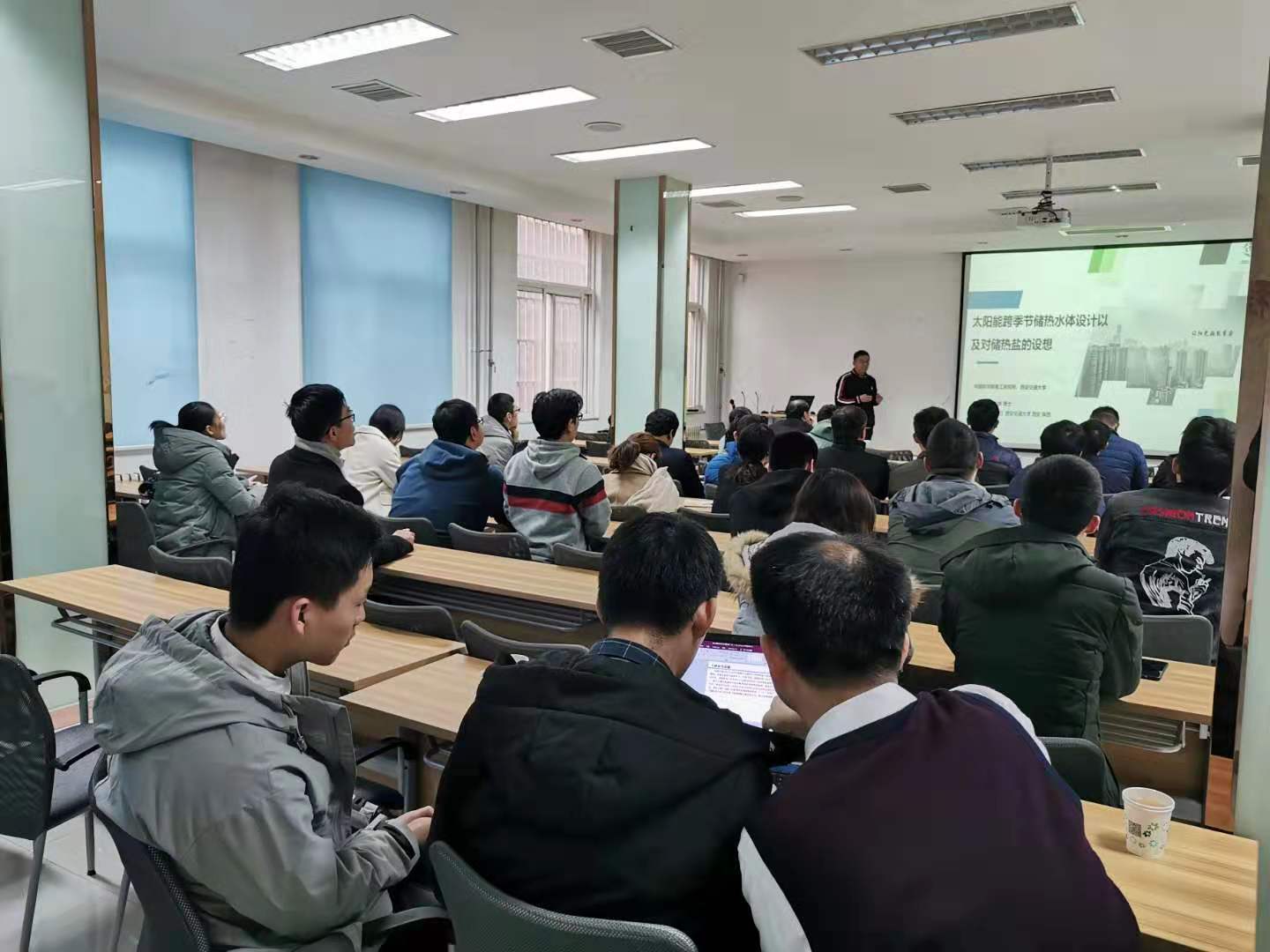 王志峰研究员作了题为“大容量跨季节储热水体设计及盐池出热的设想”的讲座。讲座从水体分层与太阳能场动态耦合技术、水体与土壤耦合传热抑制技术、动态充热取热与温度分层稳定性几个方面介绍了大容量跨季节储热水体设计的主要技术。紧接着,报告介绍了目前储热方式温度场不协同的问题,做出使用盐池跨季节储热的设想,即利用盐形成浓度分布实现温度场协同的效果。最后,王志峰研究员介绍太阳能区域供热关键技术发展方向:集热场与储热体节能设计和长距离输热;并对现有项目的技术指标和经济指标做了介绍。