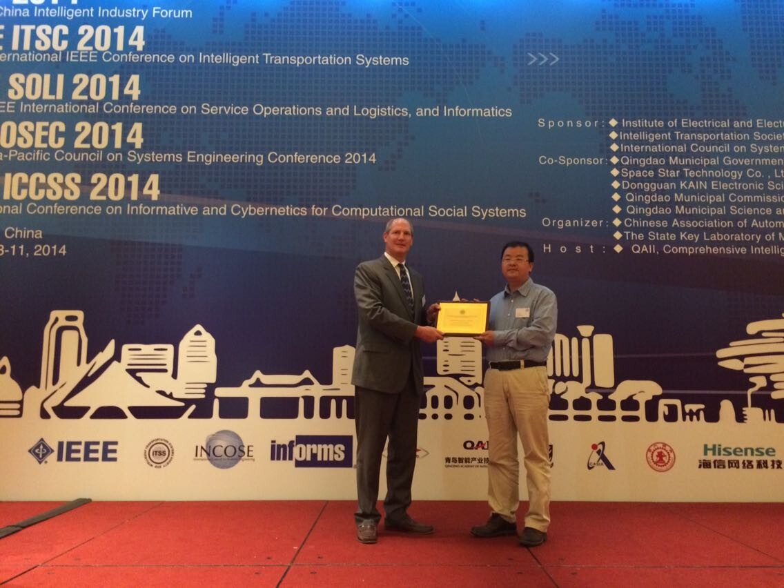 The Intelligent vehicle team of Institue of Artificial Intelligent and Robotics, Xi'an Jiaotong University, led by Prof Nanning Zheng, won IEEE ITS Institute Lead Award of 2014. The award ceremony was held in Oct 9, 2014, in Qing Dao, China, during the IEEE Intelligent Transportation System Conference 2014. Prof. Jianru Xue recieved the award certificate from Prof. Matthew J. Barth, who is the current president of IEEE ITS society. He also gave the Award Speech for the IEEE ITS Institute Lead Award in the Plenary Session in Oct 10,2014.