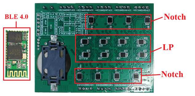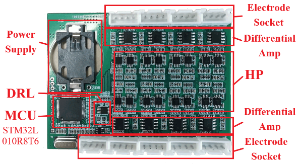 舒适型可穿戴式ECG信号采集系统。自主研发的非接触式ECG测量技术与高自适应性的去伪迹算法结合可以实现多种运动状态下穿戴式ECG信号的高质量采集。自主设计了一种具有超高输入阻抗的电容耦合PCB电极,不需要与皮肤直接接触,而是通过电极与皮肤表面间的耦合电容将ECG信号耦合至电极上,使用方便、采集舒适度高而且不刺激、不损伤皮肤,适合人体ECG信号长期便携式采集。