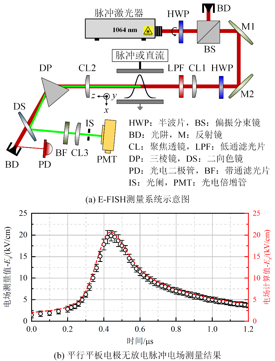 基于电场致二次谐波产生(Electric field inducedsecondary harmonic generation, E-FISH)原理的激光探针具有非侵入式、适用气体种类广、高灵敏度、信号直接检测、光路简洁等优点,可适用于大气压脉冲流注放电空间电场测量。