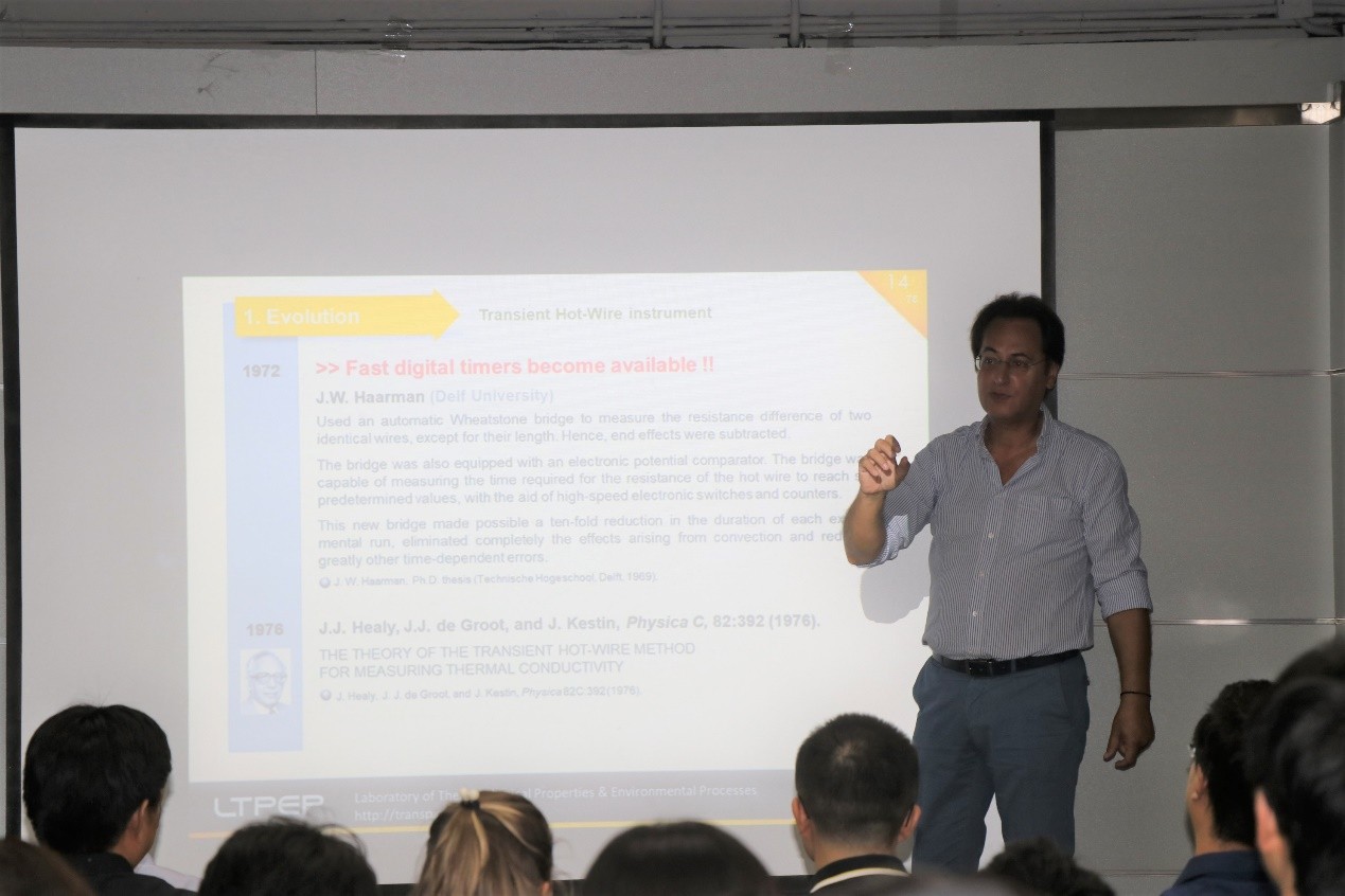希腊亚里士多德大学Marc Assael教授于2019年9月27日至10月6日访问了热力学小组,并分别作了“Why Validation Through Experiment Matters”和 “Proper Application of the Transient Hot-Wire Technique in the Measurement of the Thermal Conductivity of Gases, Liquids, Nanofluids, Melts and Solids”两场学术报告。报告中,Assael教授先介绍了用实验验证热物性数据的重要性。随后,介绍了导热系数测量的发展历史,测量方法以及Assael教授课题组在导热系数测量领域所作出的成果。报告结束后Assael教授对师生们提出的问题给予了耐心详细的解答,使大家收获良多。访问期间,Assael教授还参观了热力学小组的实验室,与师生们进行交流和讨论。