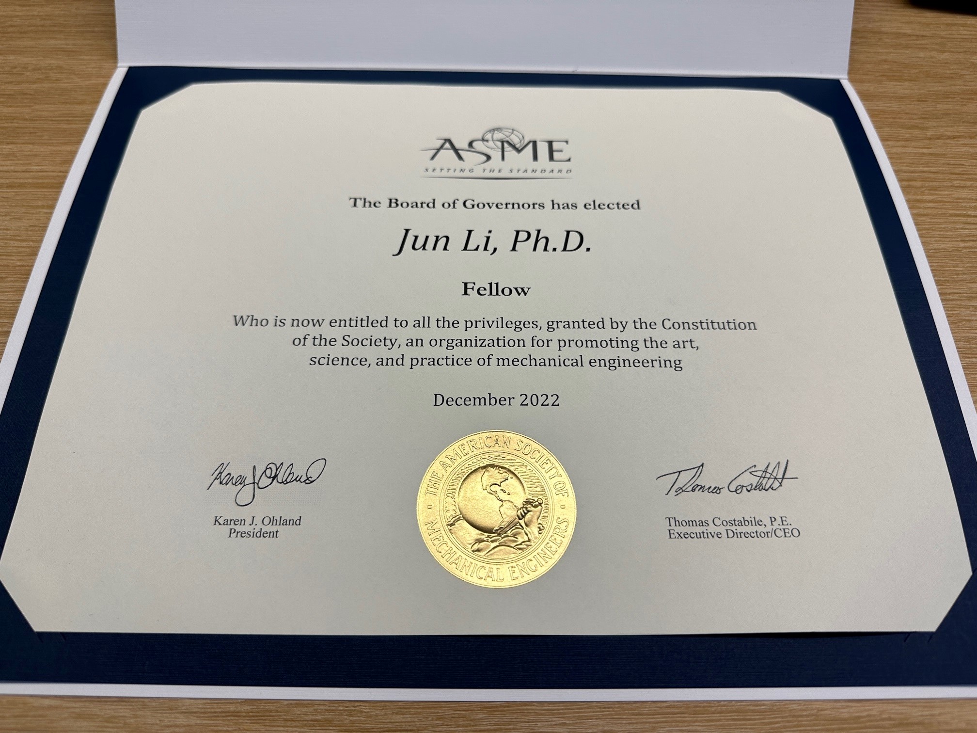 2022年12月,当选为ASME Fellow