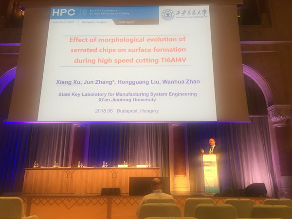 - 2018年6月25-27日,张俊老师带领何勇和许祥两位博士生前往匈牙利布达佩斯参加了第八届国际生产工程学会高性能切削会议(8th CIRP Conference on High Performance Cutting,简称HPC2018)。HPC会议是加工领域的国际顶级学术会议,CIRP的两任主席分别做了KEYNOTE报告。课题组博士生何勇和许祥分别在分会场做了学术报告,汇报题目分别为”Interfacial effects on the dynamic stresses in high speed cutting of heterogeneous materials”和”Effect of morphological evolution of serrated chips on surface formation during high speed cutting Ti6Al4V”,报告引起了同领域学者的很大兴趣并就具体细节进行了热烈讨论。