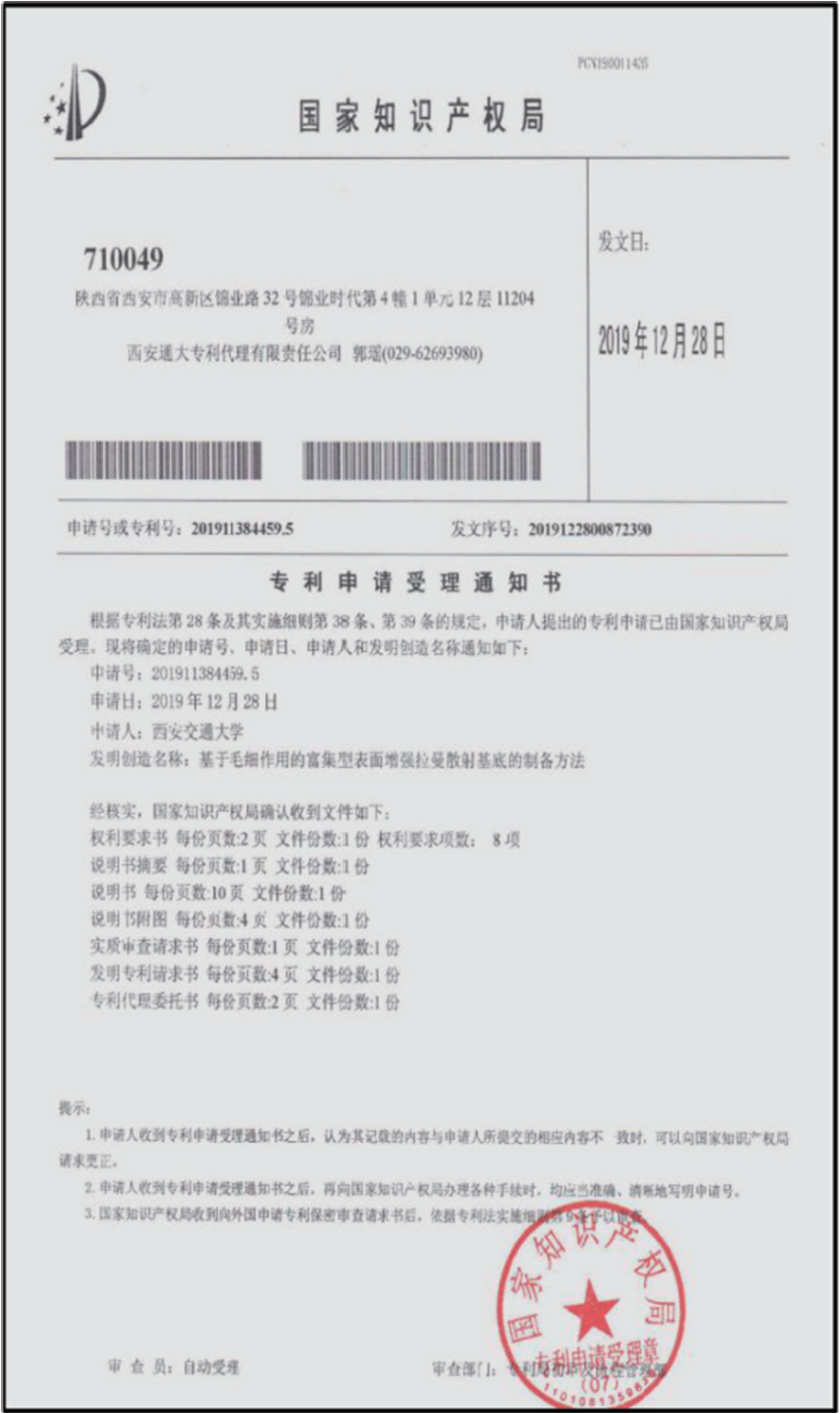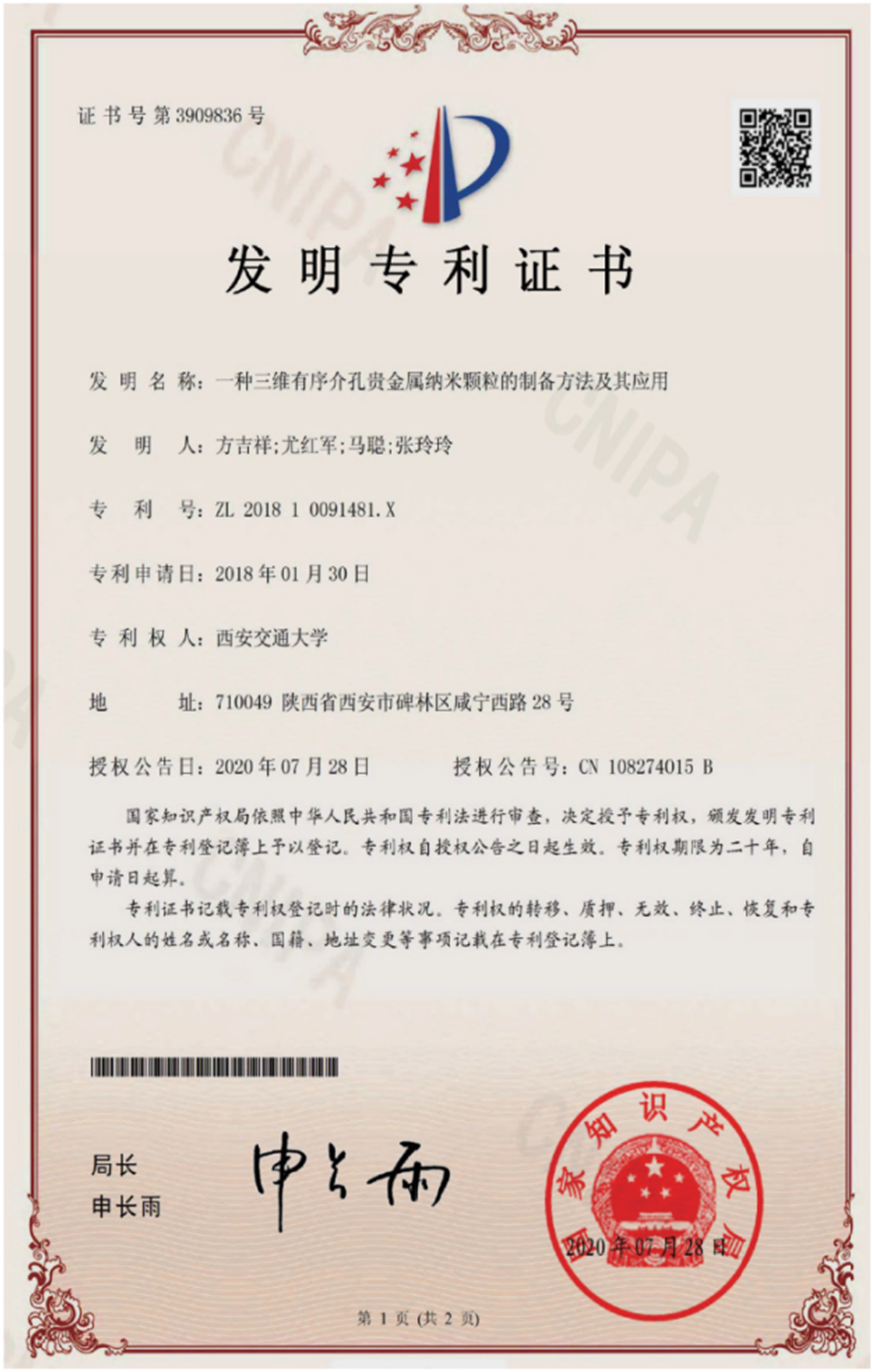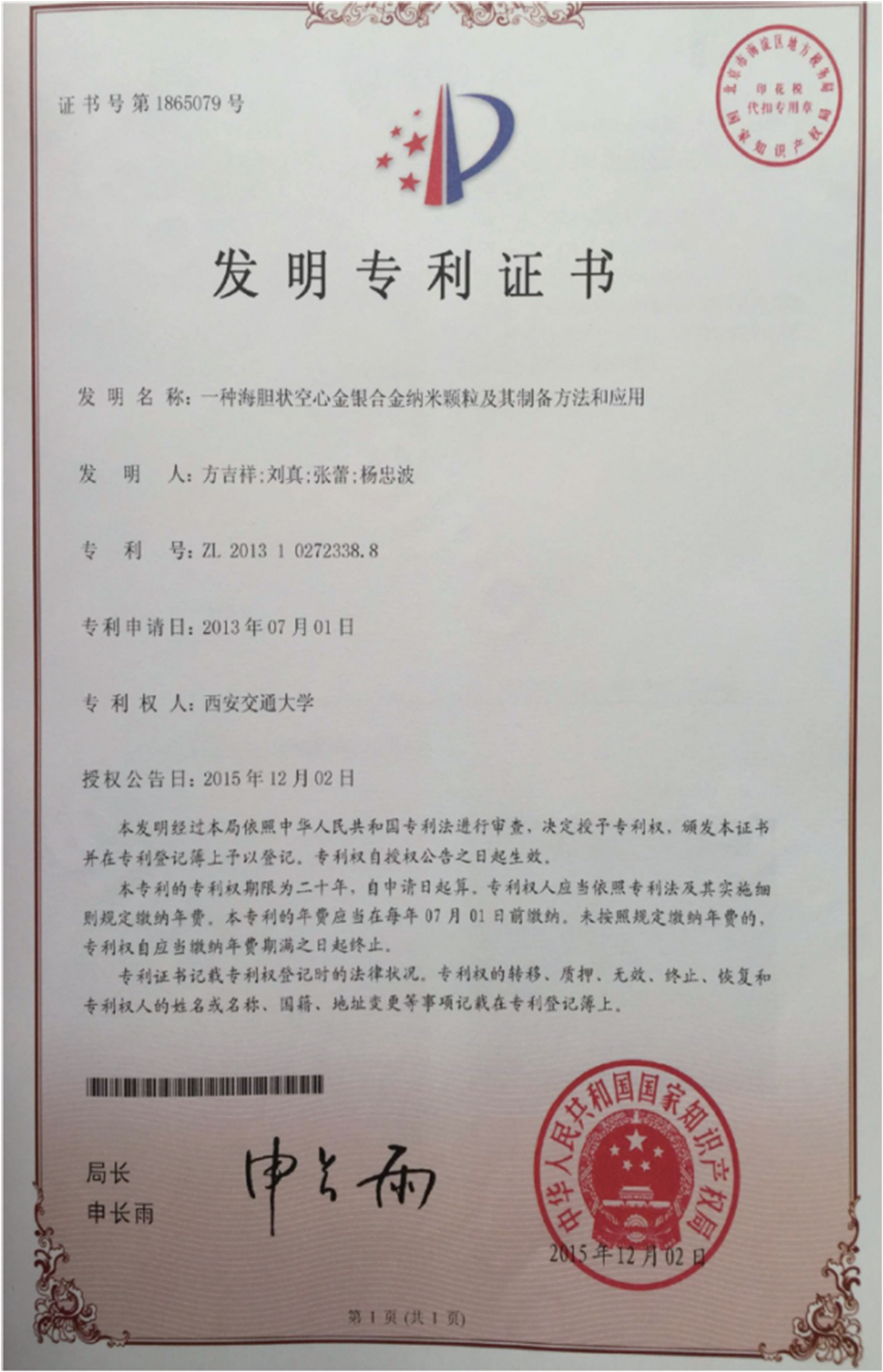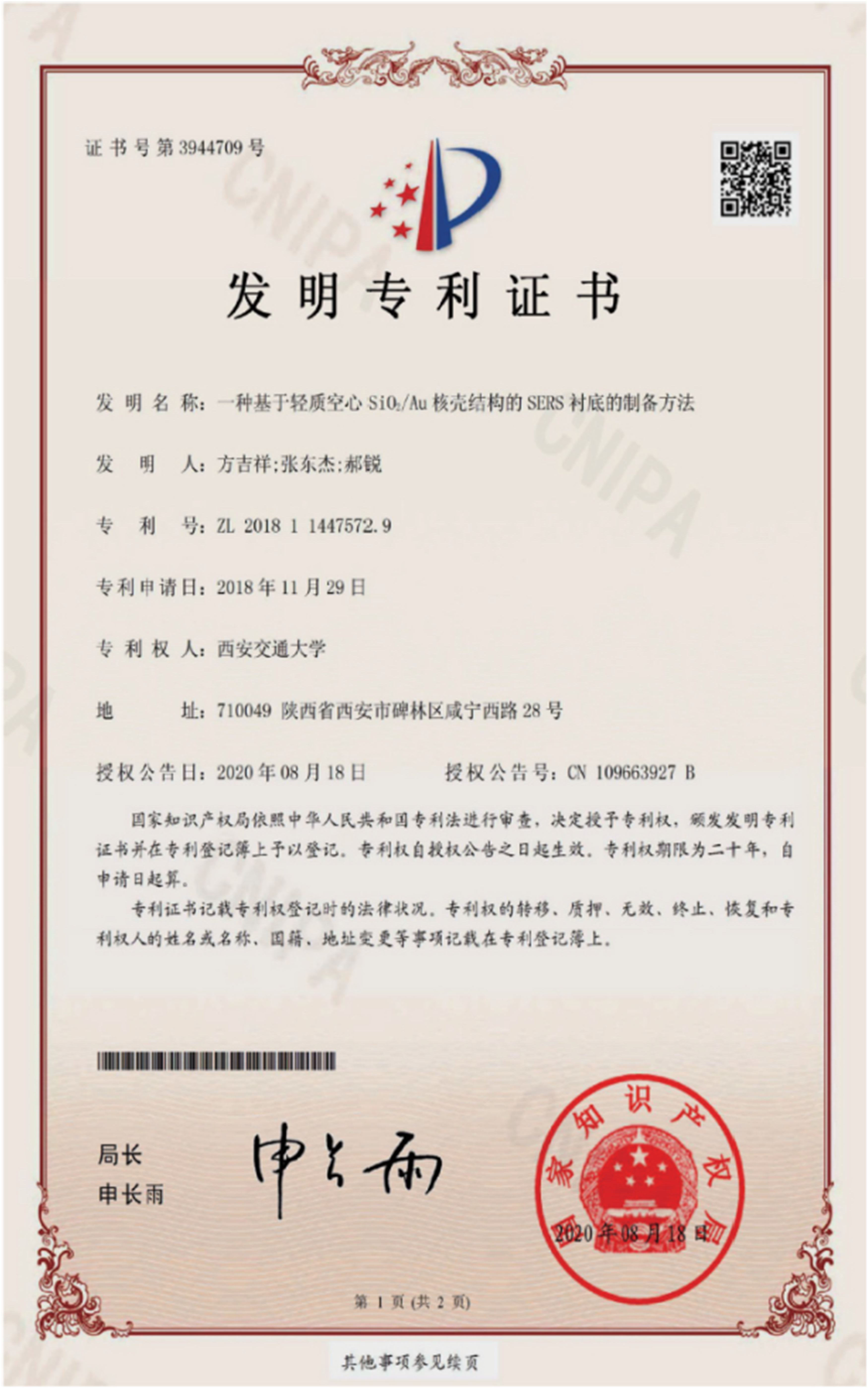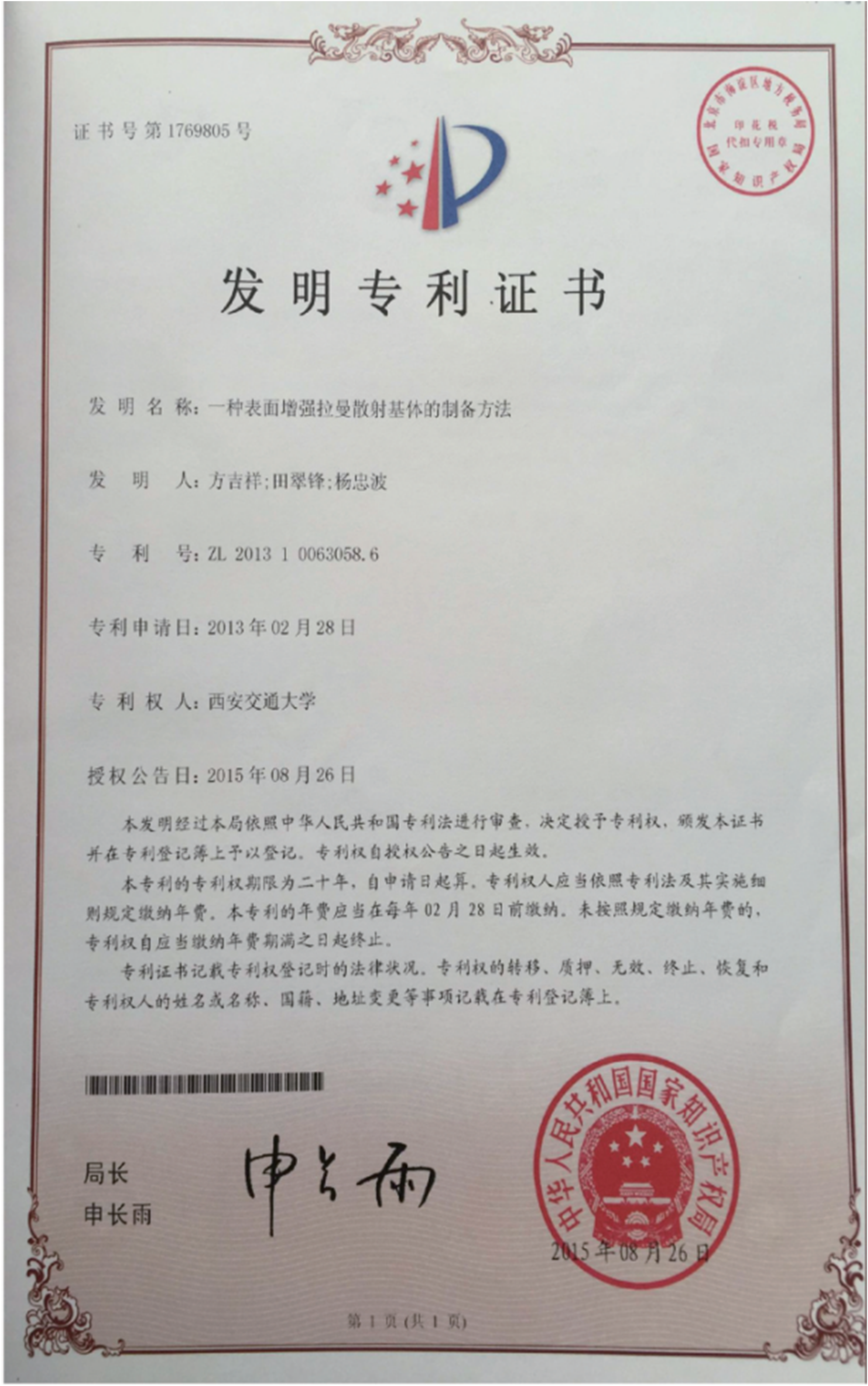 [1] 一种表面增强拉曼散射基体的制备方法,发明人:方吉祥,田翠峰,杨忠波.201410063058.6 [2] 一种海胆状空心金银合金纳米颗粒及其制备方法和应用,发明人:方吉祥,刘真,张蕾.201310272338.8 [3] 一种三维有序介孔贵金属纳米颗粒的制备方法及其应用,发明人:方吉祥,尤红军,张东杰,郝锐.2018114475729 [4] 一种基于轻质空心SiO2/Au核壳结构的SERS衬底的制备方法,发明人:方吉祥,张东杰,郝锐.201811447572.9 [5] 一种基于毛细作用的富集型表面增强拉曼散射基底的制备方法,发明人:方吉祥,郝锐,尤红军.201911384459.5 [6] 一种磁性纳米颗粒—环糊精复合吸附剂、制备方法及应用,发明人:方吉祥,张玲玲,郭雨,尤红军.202011345490.0