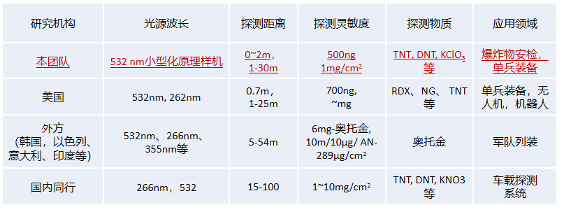 发展高效、可靠的远距离微痕量检测技术在军事和民 用等公共安全领域具有重要的现实意义,可以在更大程度上阻止恐怖分子利用爆炸物进行恐怖袭击;可以应对军事战争中的核、生、化问题,牢筑国家核、生、化安全防线;可以提升重大危险化学事故的预防、处置能力。此外,还可以进行毒品检测以及星际勘探与矿物分析;同时还可以满足大气空间环境检测等民用需求。因此,远距离的痕量检测技术具有重要的研究价值和应用前景。