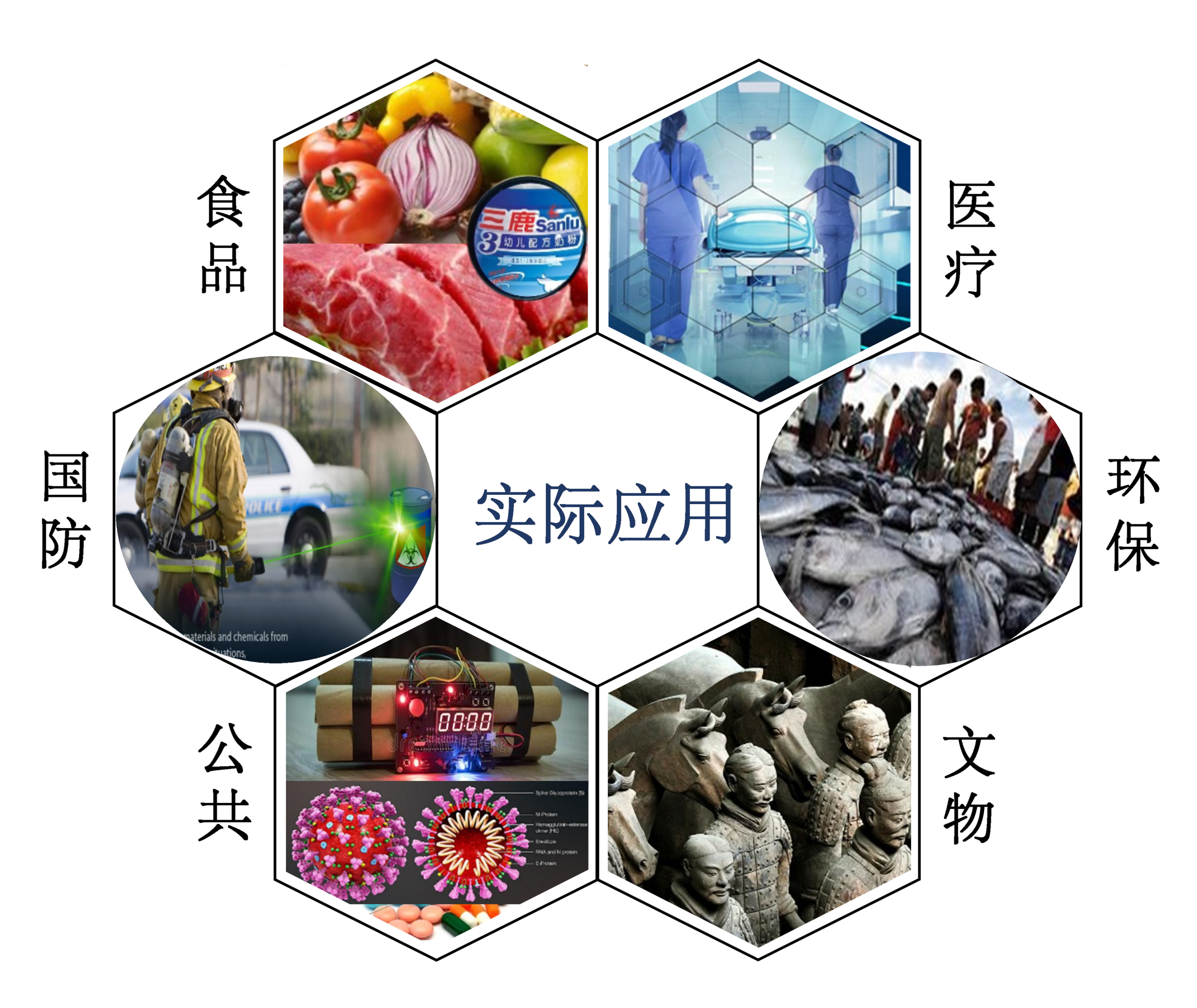 本团队基于表面等离激元及增强光谱技术原理,设计构造了多种新型增强光谱纳米探针与SERS增强器件,研发了多种分子、生物样品快速富集关键技术,并在公共安全、食品安全、环境监测等领域得到多项技术推广应用。