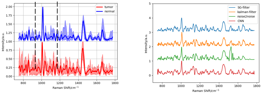 ► 正常组织和癌症组织峰值的差异 ► 使用不同算法的光谱处理效果图