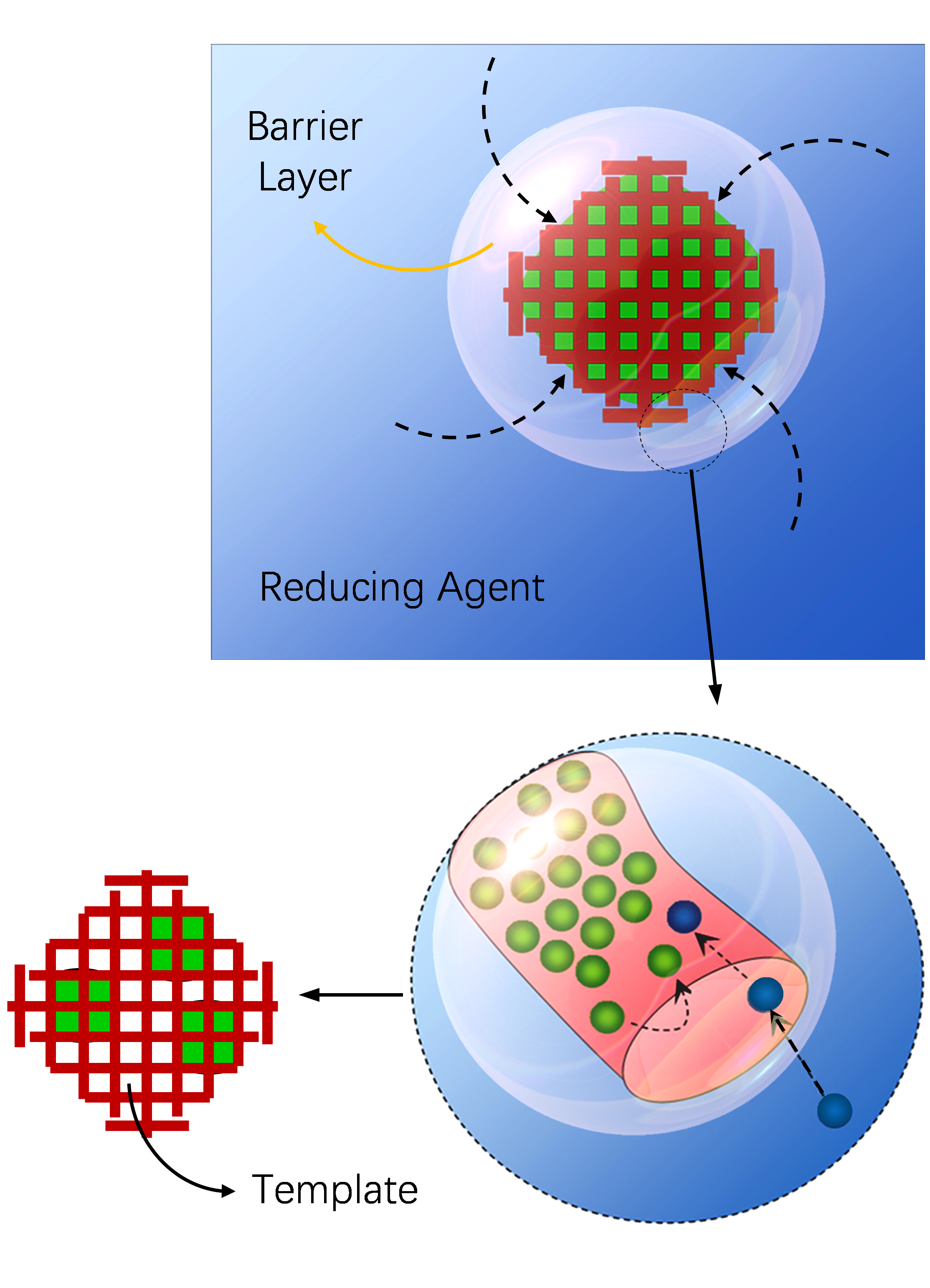 - 提出了通过“软包覆”原理,成功解决了介孔材料三维受限空间内贵金属产物向模板外扩散这一长期国际技术难题,获得了高效贵金属催化剂规模化制备新方法;