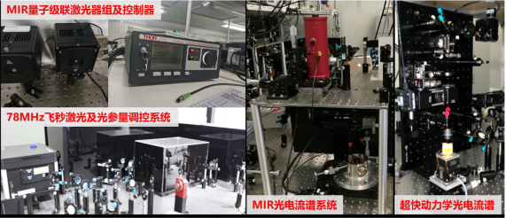 平台拥有多波段的中红外光源和及其光电流谱表征技术,包括美国Thorlabs公司的4μm波段的量子级联激光器(QF4050C2,控制器ITC4005QCL),可产生连续中红外光,以及相干公司的78MHz高重频飞秒激光系统(Mira900)并配备了如OPA、DFG等多种光参量转换调制设备,可以产生波长3-10μm的中红外波段飞秒激光。利用这些光源已经搭建了多套中红外扫描光电流谱系统,可以实现微米和百飞秒级高精度时空分辨且具有多光参量(波长、偏振等)分辨的中红外光电探测,并且系统还具有近紫外到近红外波段的光电流探测能力。