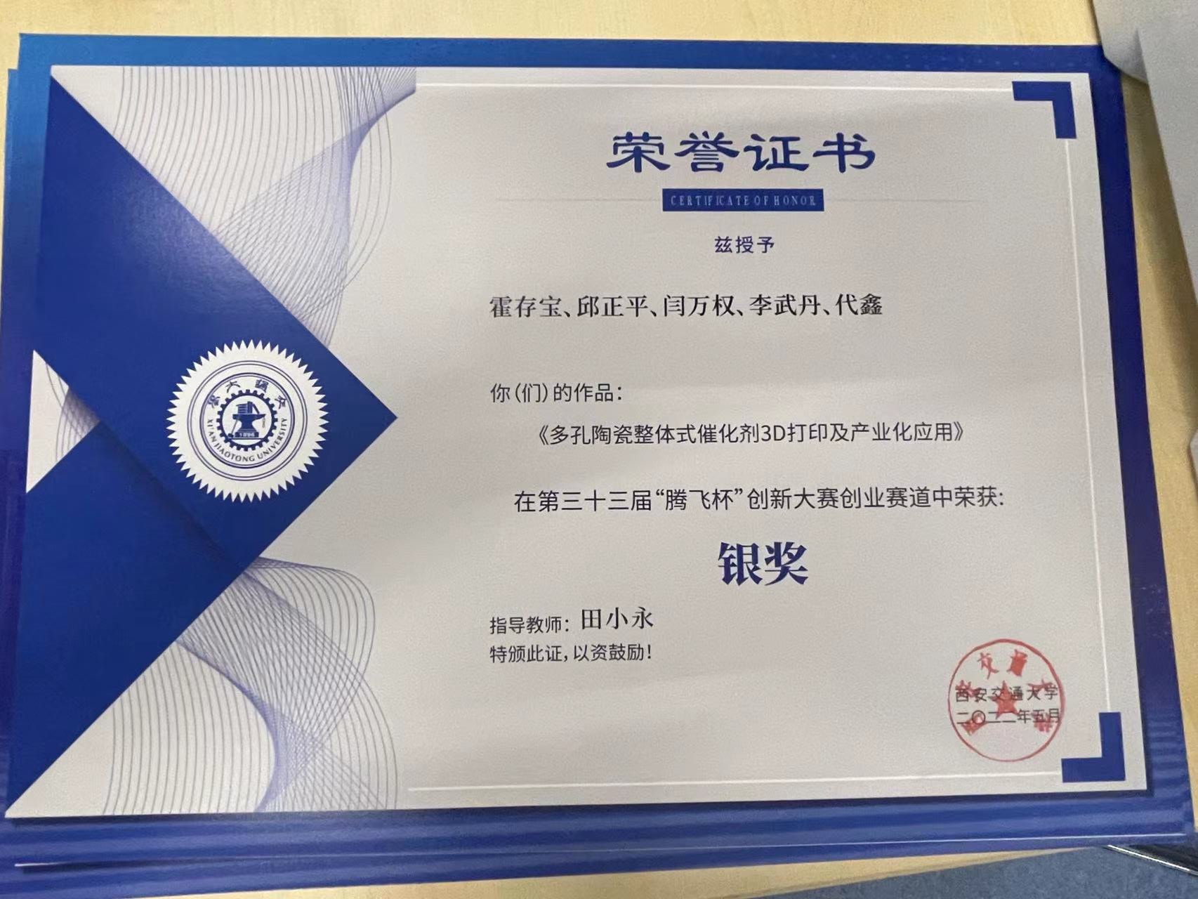 - 《多孔陶瓷整体式催化剂3D打印及产业化应用》获腾飞杯创新创业大赛银奖、一等奖!