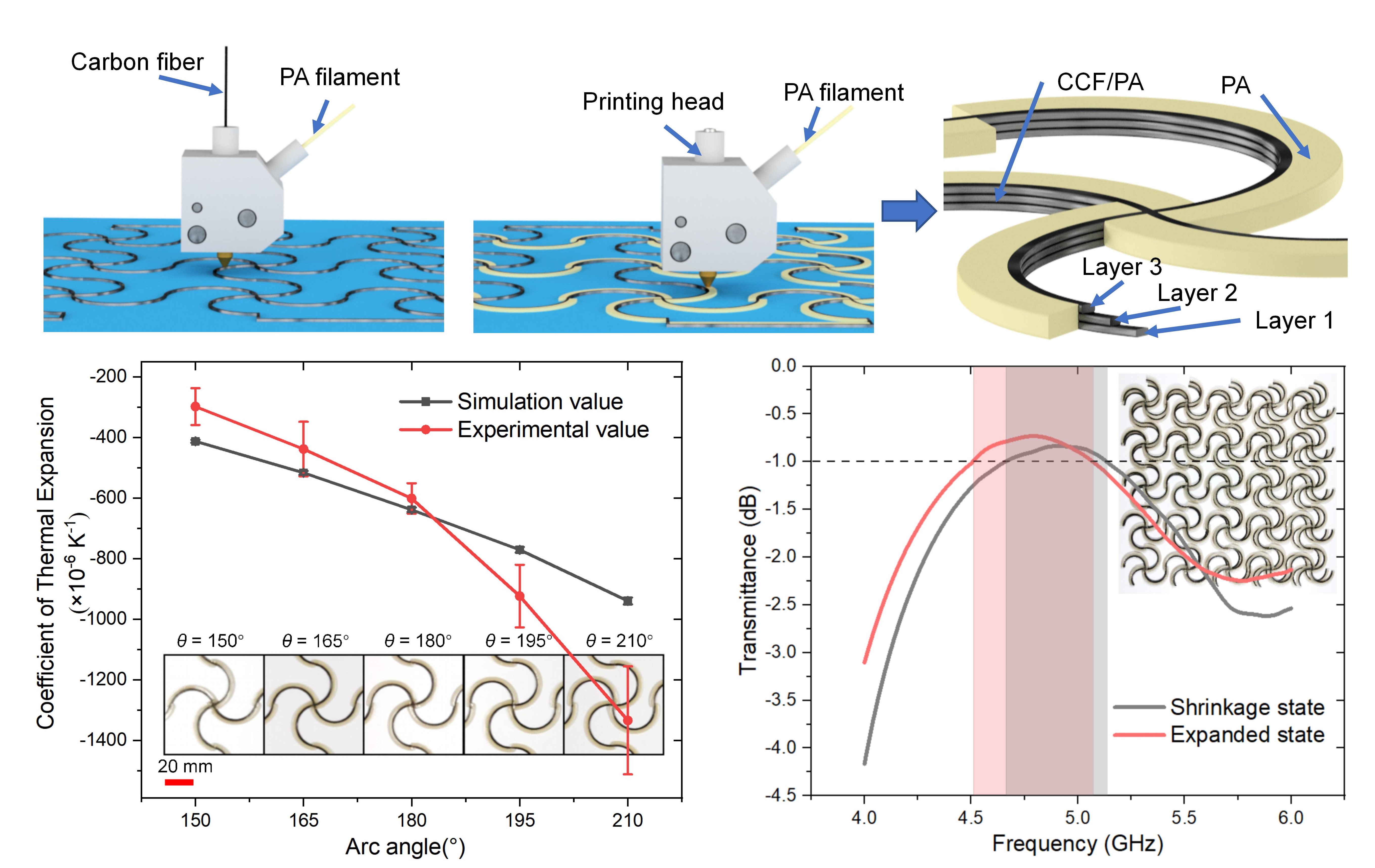 连续碳纤维具有良好的导电导热性能和极低的热膨胀系数,研究团队利用其与树脂基体热膨胀系数差异明显的特性,提出了一种基于连续碳纤维的热变形可调谐超表面的设计与4D打印方法,通过连续纤维复合材料手性结构设计,将复合材料和热塑性树脂分区沉积成形,基于理论计算、有限元分析和实验揭示了结构参数对热变形和电磁频率控制的影响规律。所制备超表面结构的最大热膨胀系数测量值达到了1333×10-6 K-1,实现了等效热变形前后的超表面对-1 dB电磁波透射频段28.1%的偏移,该方法为空间天线结构在轨电磁性能调控提供了一个新思路。研究成果以“4D printed thermally tunable metasurface with continuous carbon fiber”为题发表在期刊《虚拟与物理原型》(Virtual and Physical Prototyping)上,论文第一作者是西安交通大学博士生康友伟,田小永教授为唯一通讯作者,论文作者还有西安交通大学李涤尘教授,吴玲玲副教授,航天五院西安分院马小飞研究员等。