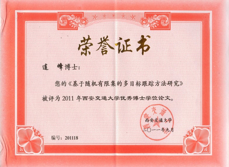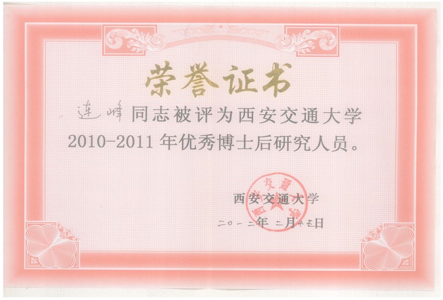 2010-2011年西安交通大学优秀博士后研究人员;
