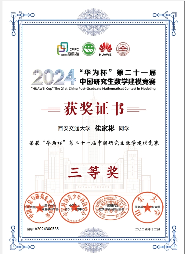 课题组成员郭译文,桂家彬与多相流国重实验室研究生胡书瑞组队参加2024华为杯数学建模竞赛,获国三等奖。