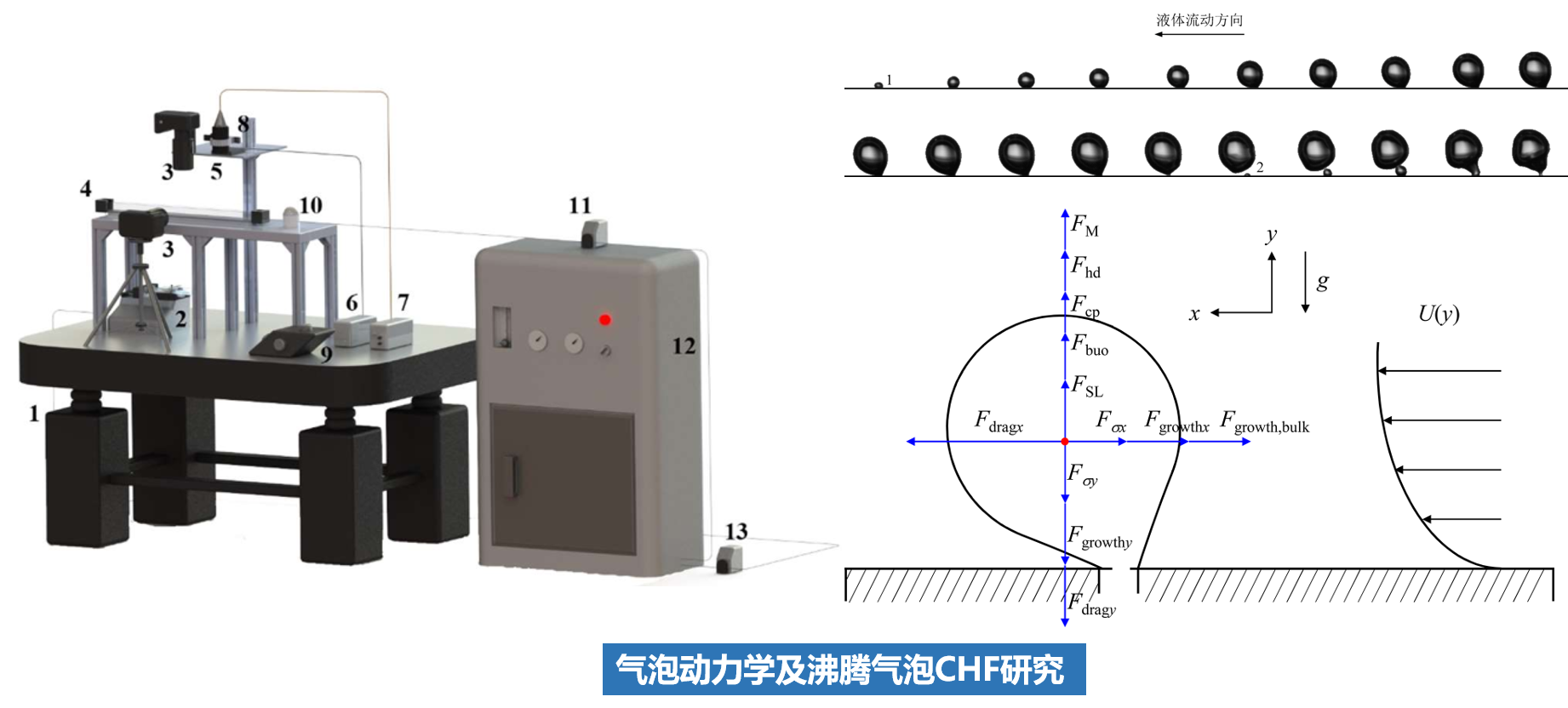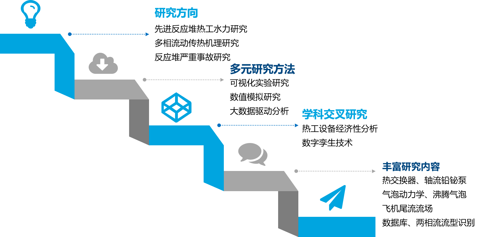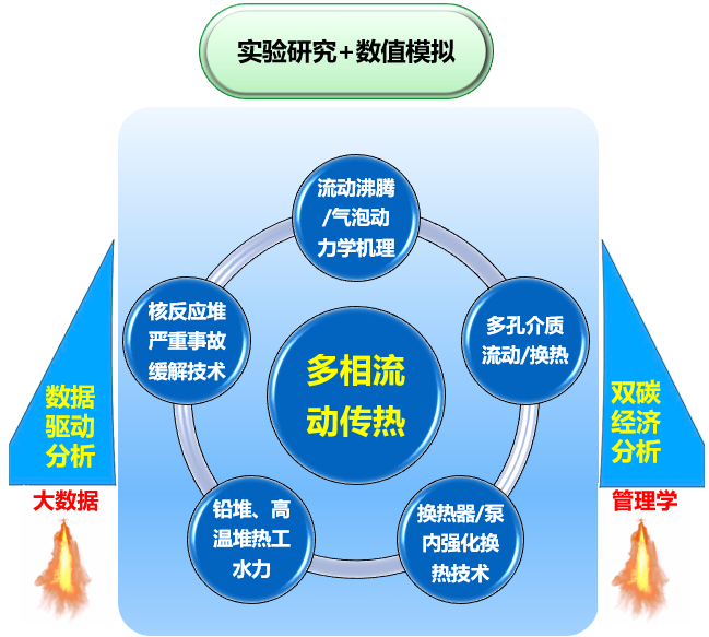 面向能源(化石能源和新能源)、动力(常规动力和核动力)领域内关键理论和核心技术,围绕多相流动传热问题开展理论分析、实验研究和数值计算研究工作,研究方向涉及流动沸腾及强化换热、多孔介质内单相/两相流动换热、先进反应堆热工水力及关键部件的优化设计、反应堆严重事故缓解技术等,并积极探索和利用数据驱动与人工智能技术、低碳经济及可持续发展理论开展学术交叉研究。