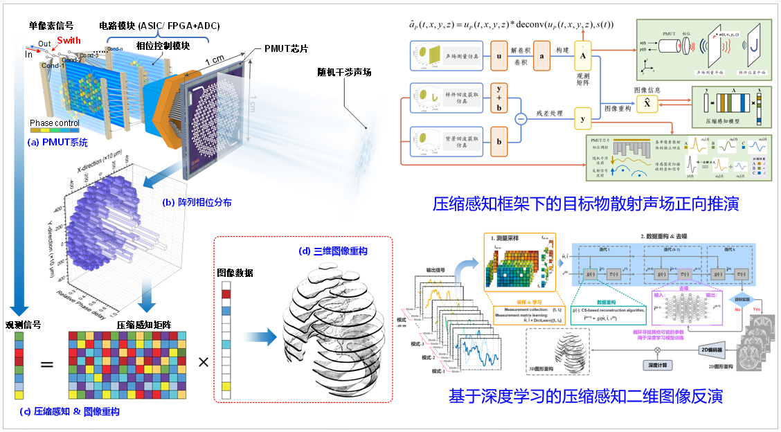 将压缩感知理论框架引入超声三维成像技术,通过PMUT阵型设计和相位控制,物理实现超声回波的空间传输编码与压缩采样,突破传统聚焦超声成像原理以及奈奎斯特采样定律的限制,形成高效、高分辨的三维图像重构方法。