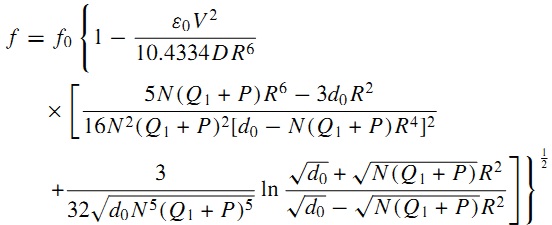 公式:CMUT谐振频率与结构参数、偏置电压和流体压力之间的数学表达式(J. Phys. D: Appl. Phys. Vol.46, No.19, 195108,2013)