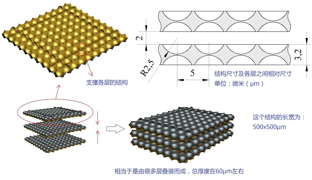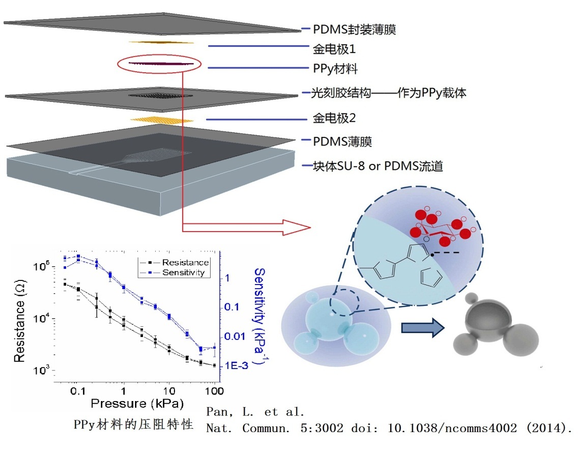 为了提高微压强测量传感器的灵敏度,不仅要求传感器的结构设计合理,更需要有合适的材料作为传感器的敏感元件。在保证传感器结构强度以及稳定性的情况下,需要提高传感器的灵敏度和线性度。本设计基于微通道的微压强传感器,结构如(图1)。此压强传感器利用聚吡咯水凝胶材料作为敏感材料,利用其特有内部空心球状微观结构(如图2)而使其具有的体压阻以及表面压阻效应,大大提高了传感器在工作中的灵敏度。在此基础上,通过微细工艺在PPy与微通道的接触面上利用宏微结合的硅模具(如图3)制作出阵列化图案,大大加强PPy材料的压阻效应。