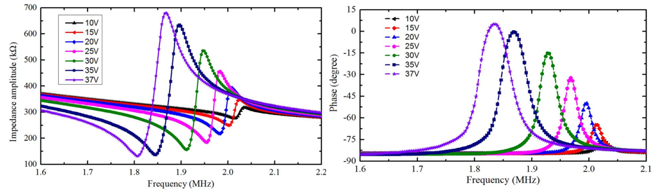 CMUTs的制备工艺一直以来是一个难题,通过课题组成员的努力,研制出基于低温晶圆直接键合技术制备的CMUTs芯片。直接键合是指两个硅片之间不使用中间层而键合的工艺步骤,也叫做熔融键合/Fusion bonding。常规的直接键合温度高至1050℃,而这一较高的键合温度会引入很大热应力,且难以与集成电路结合,因此开展了低温直接键合工艺的研究,将直接键合温度从1050℃降至了350℃,成功制备出了CMUTs器件,对所制备的芯片性能进行了实验分析,准确地测量了包括谐振频率、塌陷电压及静电形变等一些列的重要参数,并将该成果发表于Sensors & Actuators A: Physical期刊上。