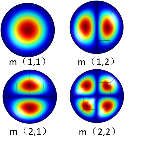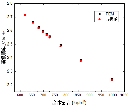 团队成员对于流体中CMUTs的谐振性能进行了研究,发现其同时受机-电耦合和流-固耦合的影响,因此将两种耦合模型结合建立CMUTs在机-电-液三场耦合理论,从而得到流体黏密度与CMUTs谐振频率的关系。利用COMSOL软件建立了CMUTs机-电-液耦合有限元模型,仿真结果与分析值误差小于0.37%。