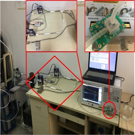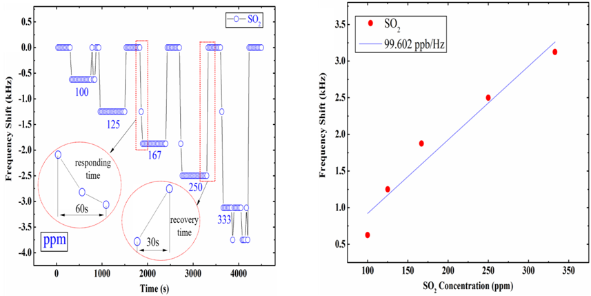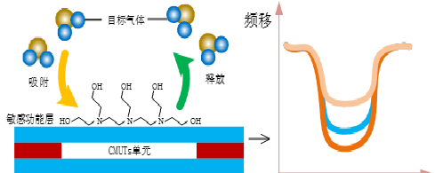 团队成员在CMUTs的气体检测领域实现了突破,设计了一种基于CMUTs的谐振式气体传感器,应用于SO2气体的检测。通过远场静电纺丝工艺结合EDT敏感材料对CMUTs传感器进行功能化,形成50~500 nm直径的珠链状纤维敏感层具有大孔隙率和大比表面积。基于CMUTs的谐振式气体传感器20V直流偏置下,工作频率达到1.756 MHz,检测100 ppm~333 ppm浓度的SO2体积灵敏度达到99.602 ppb/Hz,响应时间小于30 s,并具有循环吸附性,在便携式电子产品以及穿戴等方面具有很大的应用价值和前景。以上成果被ISMTII和2018 IEEE MEMS 高水平国际会议录用,授权和申请发明专利数项。