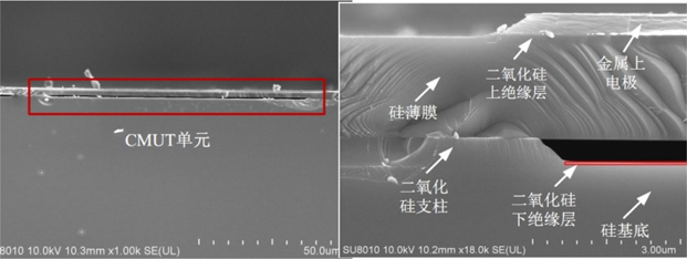 CMUTs是采用微加工技术而制备的微型超声换能器,用于超声波的发射和接收,在超声无损检测、超声指纹识别、3D超声姿态识别与非接触控制、生化物质检测、流体黏度/密度测量等领域具有很好应用前景。