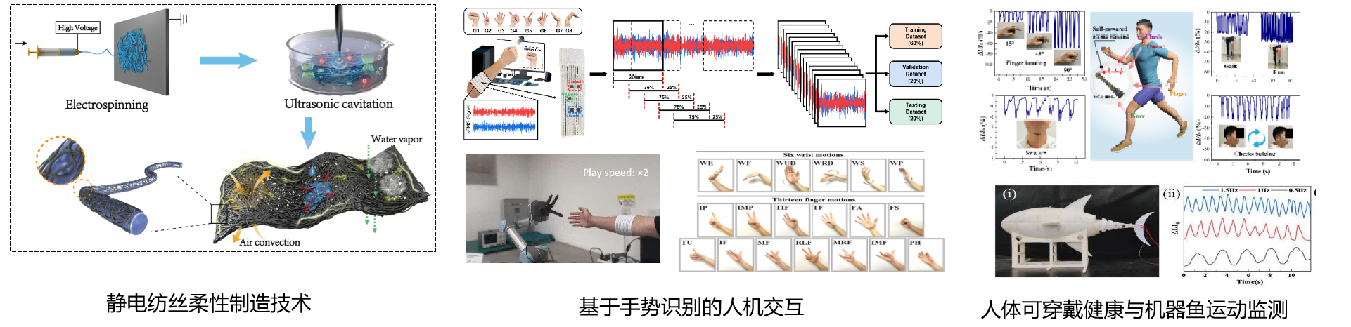针对智能机器人触觉感知、人体手势识别、人体健康监测等主要应用领域,课题组开展了柔性多参量集成传感器的研发工作,突破传感器阵列一体化加工、轻薄封装等关键技术,研究传感信号特征提取方法,实现对环境参量、人体姿态、物体材质、突发事件等信息的高效识别、分析与决策。