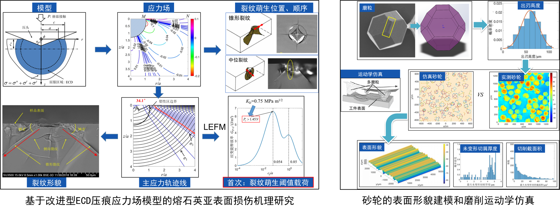 熔石英、BK7玻璃等光学元件材料在磨削时会产生显著的致密化效应,从而影响加工损伤行为。为此,改进了弹塑性压痕应力场的嵌入膨胀核心模型,提出了修正椭圆本构模型,实现了硬脆材料中裂纹萌生位置、阶段、顺序和临界载荷等的预测。研究了磨粒形状和砂轮表面形貌的精确表征方法,建立了十四面体磨粒形状、位置和出刃高度随机分布的金刚石砂轮三维几何模型,进而建立了磨削过程的运动学仿真模型,实现了工件表面形貌和未变形切屑几何参数的准确预测。