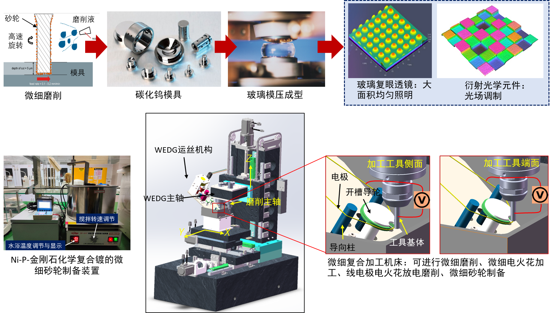 微结构光学功能元件在国防军事、消费电子等领域应用前景广阔,采用碳化钨、碳化硅、氮化硅模具的玻璃模压技术可实现超精密、大批量、低成本生产。目前的金刚石微细砂轮难以实现硬脆材料模具微结构的高效率、低损伤磨削。针对此,研制了基于Ni-P-金刚石化学复合镀的微细砂轮制备装置,提出了双络合剂+双稳定剂的高稳定性化学镀液配方,开发了微细复合加工机床。