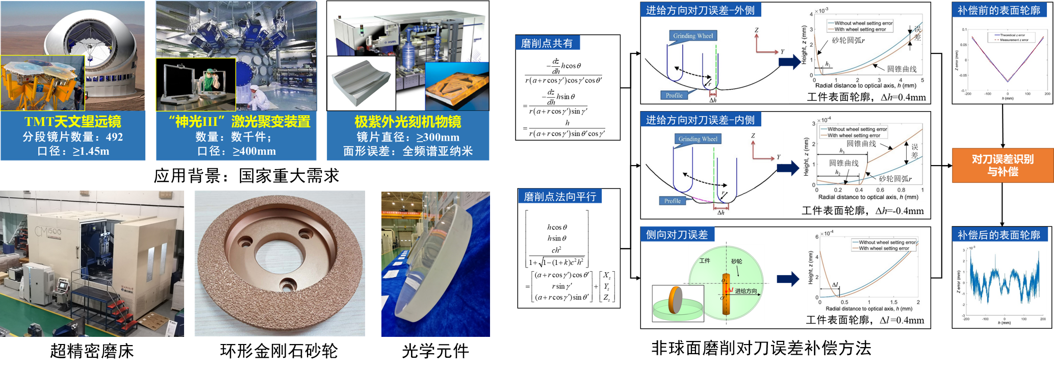 大口径非球面光学元件是高分辨率航天遥感器、大型天文望远镜、激光核聚变装置和光刻机等重大装备的核心元件,其加工精度、损伤抑制水平和制造效率是制约相关领域发展的瓶颈。本课题组研制了加工口径可达Φ1500 mm的非球面超精密磨床,填补了国内空白。研究了大口径非球面精密铣磨工艺,提出了基于砂轮面形匹配和误差分析的对刀方法以及基于误差部分补偿的圆弧包络磨削法,研究了大口径非球面的在位和离线测量技术,实现Φ400 mm以上非球面的面形精度PV值优于5 μm。
