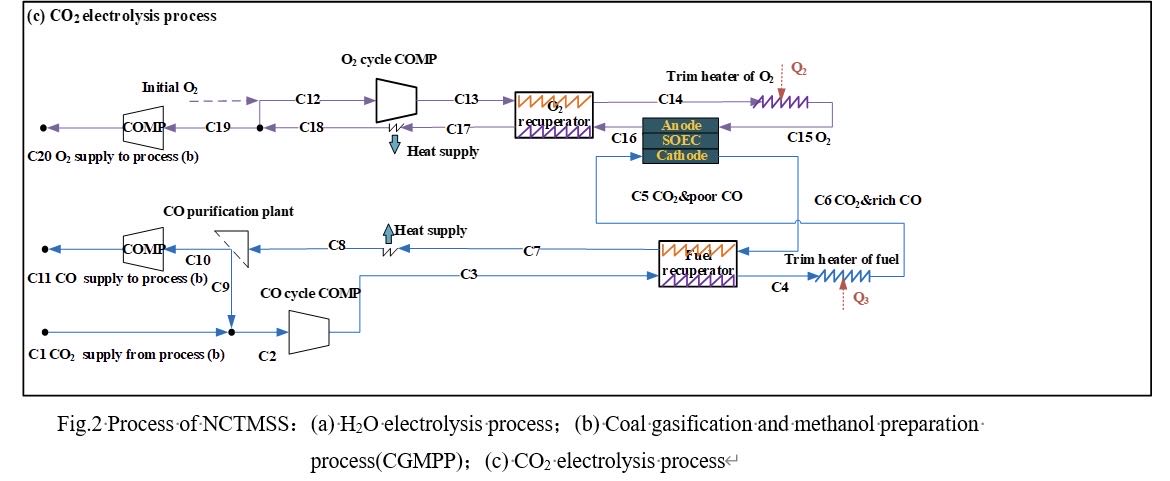 部分学者利用SOEC将绿氢引入传统CTM系统,从源头上减少碳的排放。但相关研究还具有一定的局限性,利用SOEC将绿氢引入传统CTM系统,只从源头上针对碳的减排问题,并未对尾气进一步提浓或回收。CCS给传统CTM系统高能耗的同时,无法带来产能的增益; SOFC/SOEC与传统煤制甲醇行业的耦合需要更加结合实际的零碳排放方案。
