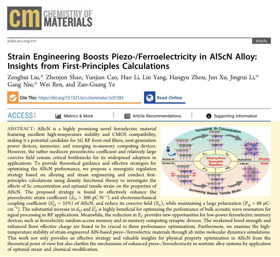 该研究成果以“Strain Engineering Boosts Piezo-/Ferroelectricity in AlScN Alloy: Insights from First-Principles Calculations”为题发表于国际权威期刊《Chemistry of Materials》上。西安交通大学刘增辉副教授、牛刚教授、李璟睿特聘研究员为共同通讯作者。该研究得到国家自然科学基金、西安交通大学高性能计算平台和国家超算西安中心的支持。