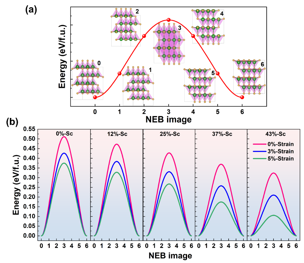 图5 (a) NEB计算过程示意图,显示了具有七种中间状态的极化翻转路径。(b)AlScN在Sc合金化和施加的双轴拉伸应变下极化翻转势垒的演化。通过过渡态表现的极化翻转势垒降低表明,协同调控作用有助于降低AlScN的矫顽场。