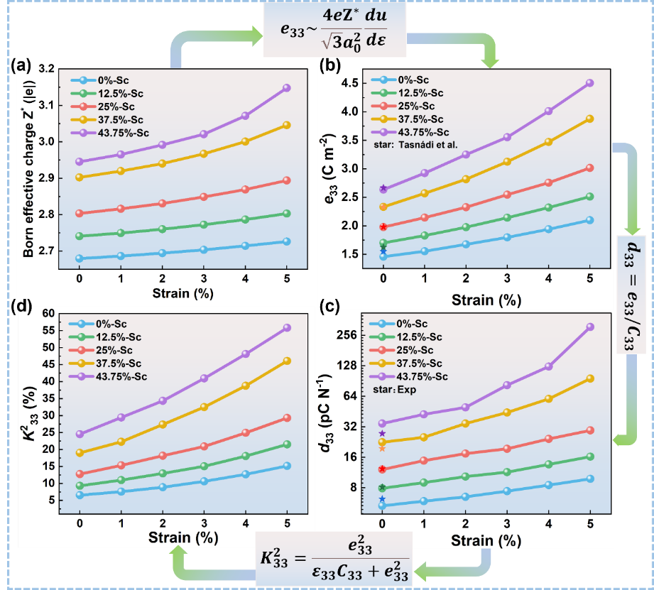 图4 Born有效电荷、压电应力系数、压电应变系数和机电耦合系数随着合金化和应变工程协同调控的演化。在协同调控作用下,压电系数d33和机电耦合系数的显著增大一方面来源于弹性软化,另一方面源于Born有效电荷的持续增强。